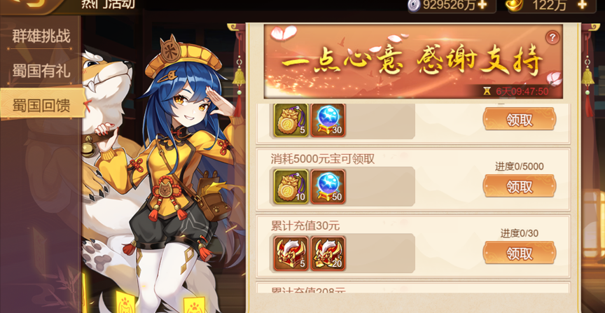 活动简介:本活动为消耗活动,活动期间,达成一定的元宝消耗数量或付费累计额度,即可领取奖励。