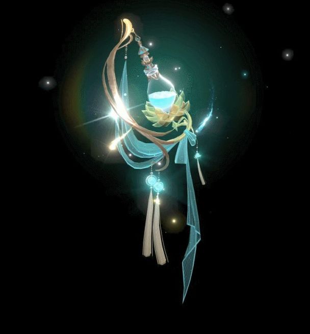 150级背饰月华清,看似为普通容器,实则为净瓶,比丘十八物之一,并非凡品。以莲花为托,净瓶中盛满可洗涤心灵之水,如月光一般温柔,散发出流光溢彩之色,瓶身轻纱点缀,似云似浪,仿佛凝结住了天地时光。