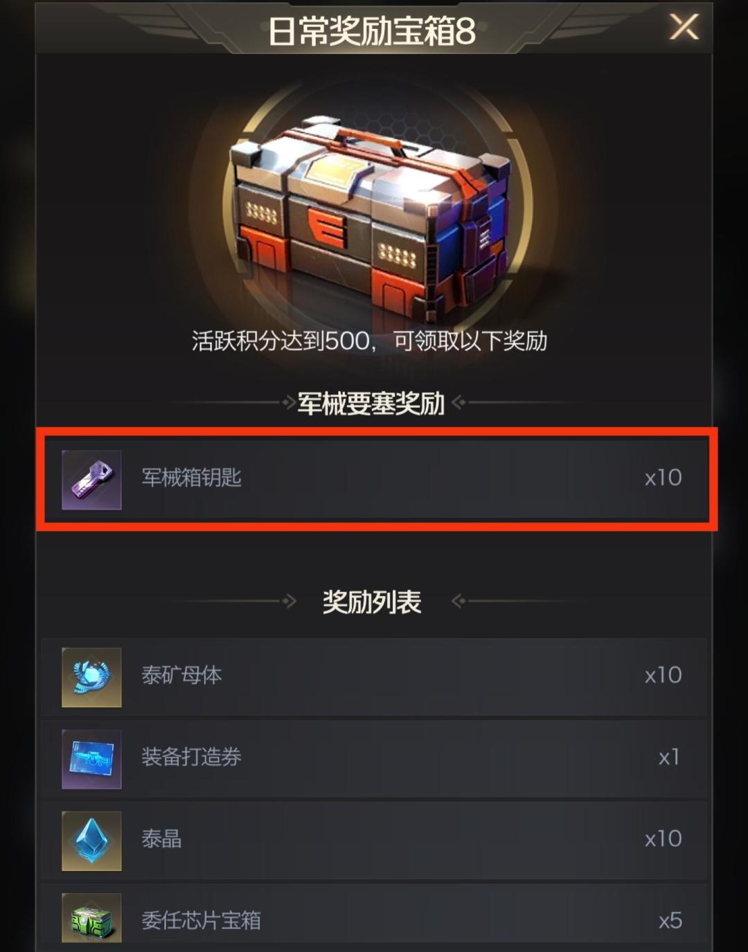 1.通过日常任务或礼包可以获取军械箱钥匙,活跃度做到500活跃总共可以获取45把军械箱钥匙,活动期间还有专属礼包可以买到军械箱钥匙。