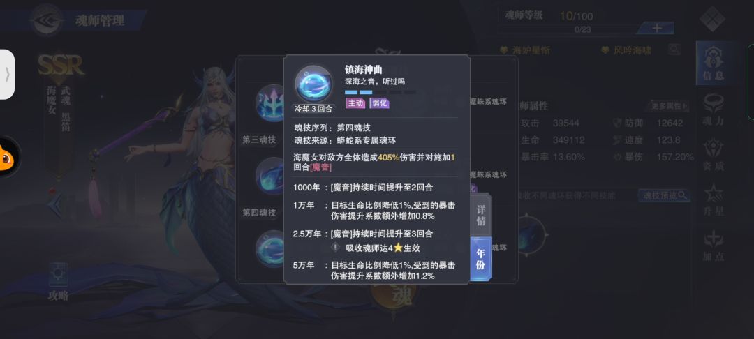 目前64级,仅测试了海魔女在长图下的强度,搭配祝福流强度非常乐观,完全可以替代掉狐狸在长图的地位。在唐晨暴雨对队也有出色的表现。但是我个人认为海魔女的强度有点过于突出,魂师对决我之所以能坚持这么久的原因也是因为它的多样性,如果一个ssr魂师的强度过于突出的话,必将让所有玩家的追求趋于一体化,所以我认为海魔女的强度需要在一定程度上削弱,例如单一搭配一种打法,只进行祝福流,这样玩家也会有多种选择。目前强度下,海魔女的长图魂环搭配为2121,一点参考意见。