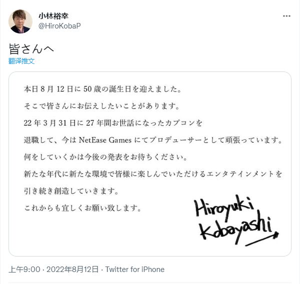 知名游戏制作人小林裕幸从 Capcom 离职加盟网易游戏