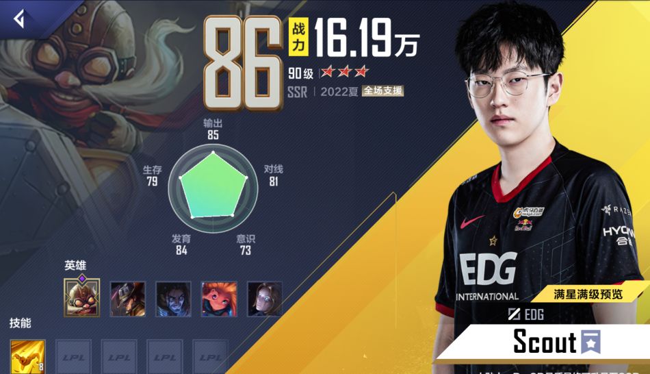 前期应当优先凑成战队阵容,得到的收益是最高的,一是可以解锁战队图鉴获得点券奖励,二是战队阵容包含的羁绊最多,会给选手很大的加成!赠送的四张SSR中,除了Scout,其他都算过渡卡,抽到Scout等于天胡开局,直接向EDG冠军阵容凑齐,活动赠送的辅助自选SSR兑换Meiko,赠送的ADC先用Gala顶替,抽到Viper后替换即可,剩下的圣枪哥,Jiejie可以添加到签约心愿单,提升概率!凑到EDG冠军阵容后会激活铁马金戈、骑士之誓、骑士精神、冠军下路羁绊,值得一用!