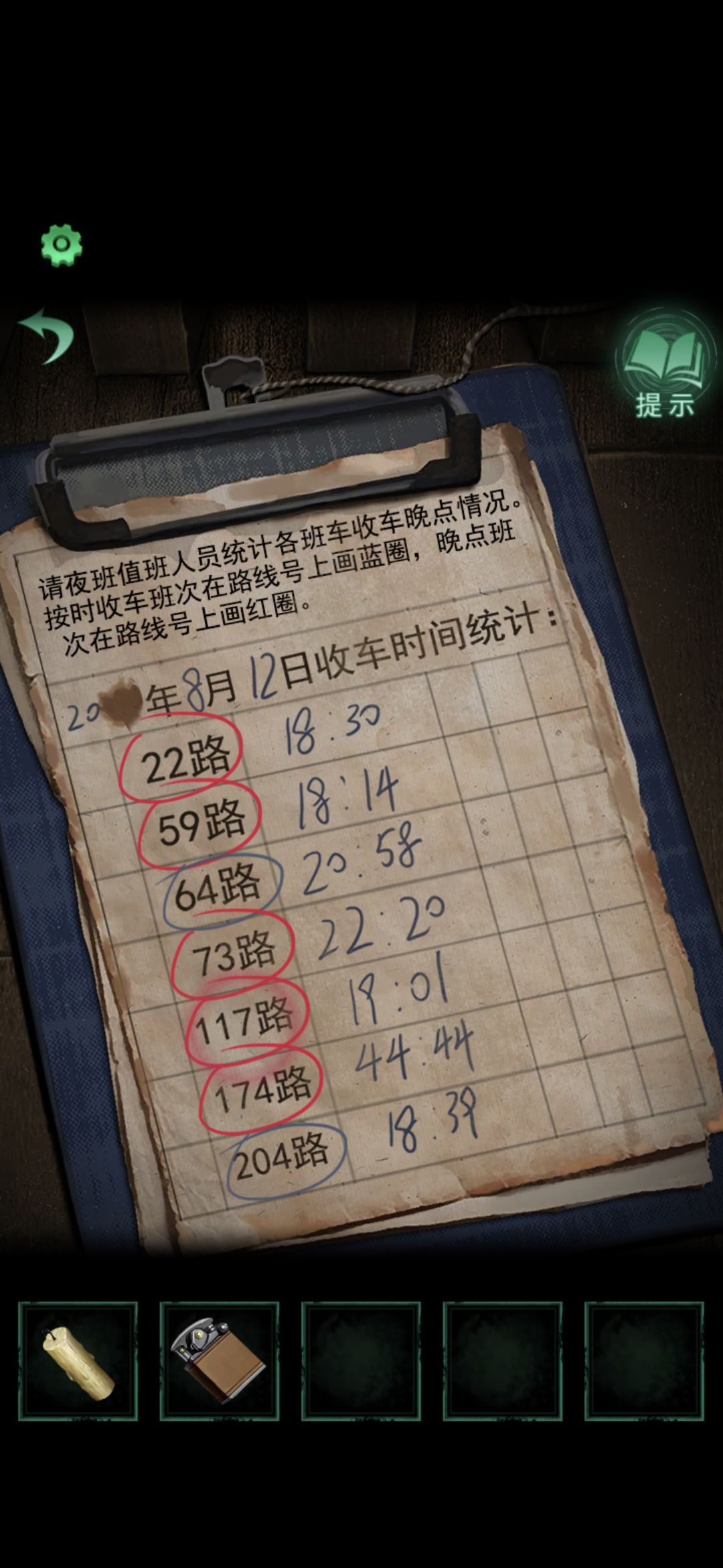 点击房子旁边的椅子,上边有表格,拾取表格旁边的蓝水笔,收车时间为末班车辆运行时间+单圈时间,在表格上画圈,顺序为红红蓝红红红蓝