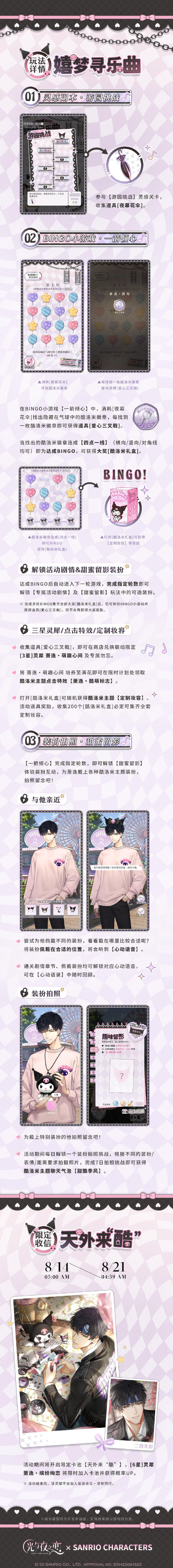 活动说明:和萧逸一起前往酷洛米主题游乐园,参与活动即可体验专属剧情,获得联动限定 [3星]灵犀 萧逸・萌趣心间、酷洛米主题特别奖励——定制妆容、点击特效【萧逸・酷萌标志】、聊天气泡【甜酷季风】等丰富奖励!