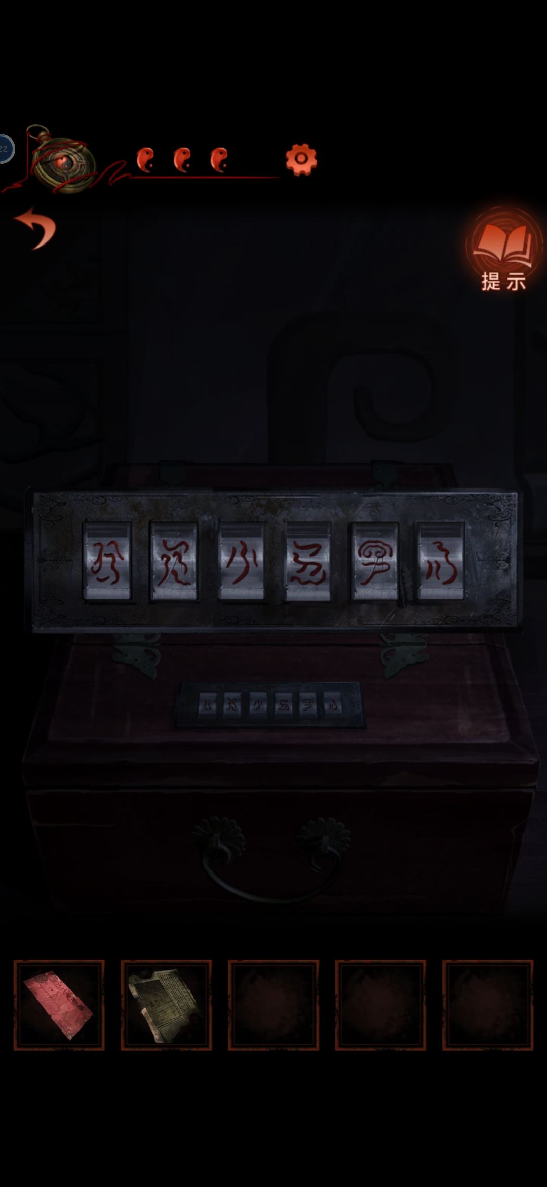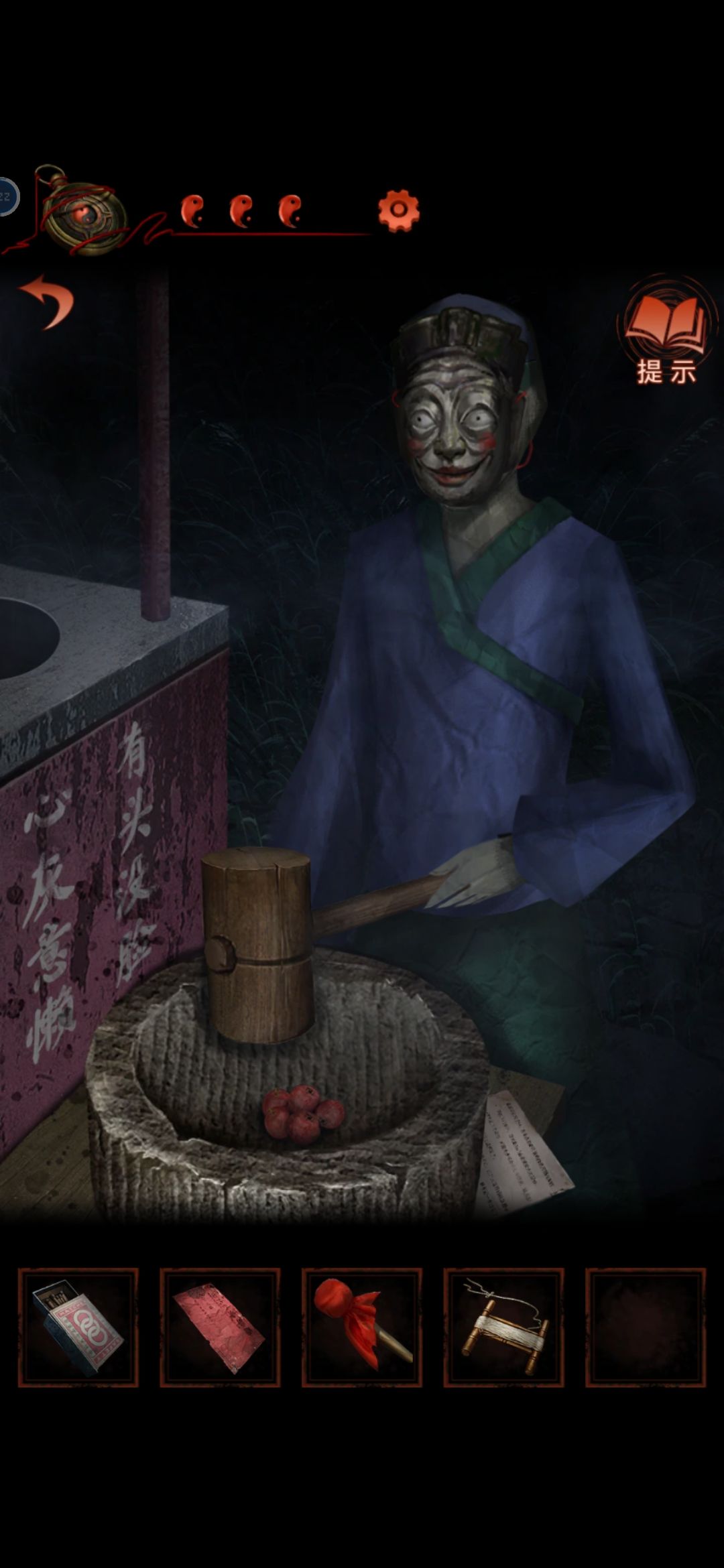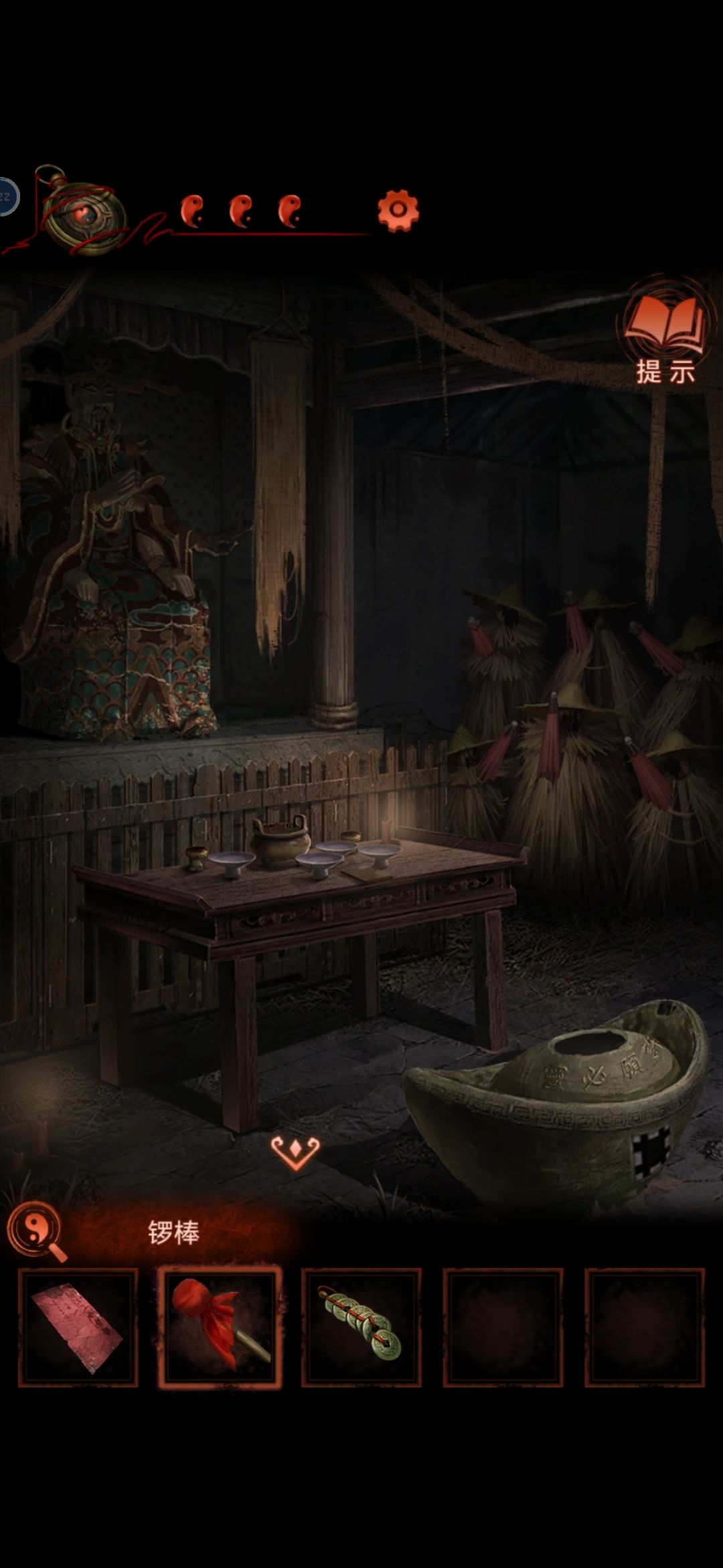 根据桌上书里的线索把礼盒摆供桌上,神像张开获得红绳,敲锣回二更,红绳给木偶(高能),挂到谜底上,获得报纸打开箱子