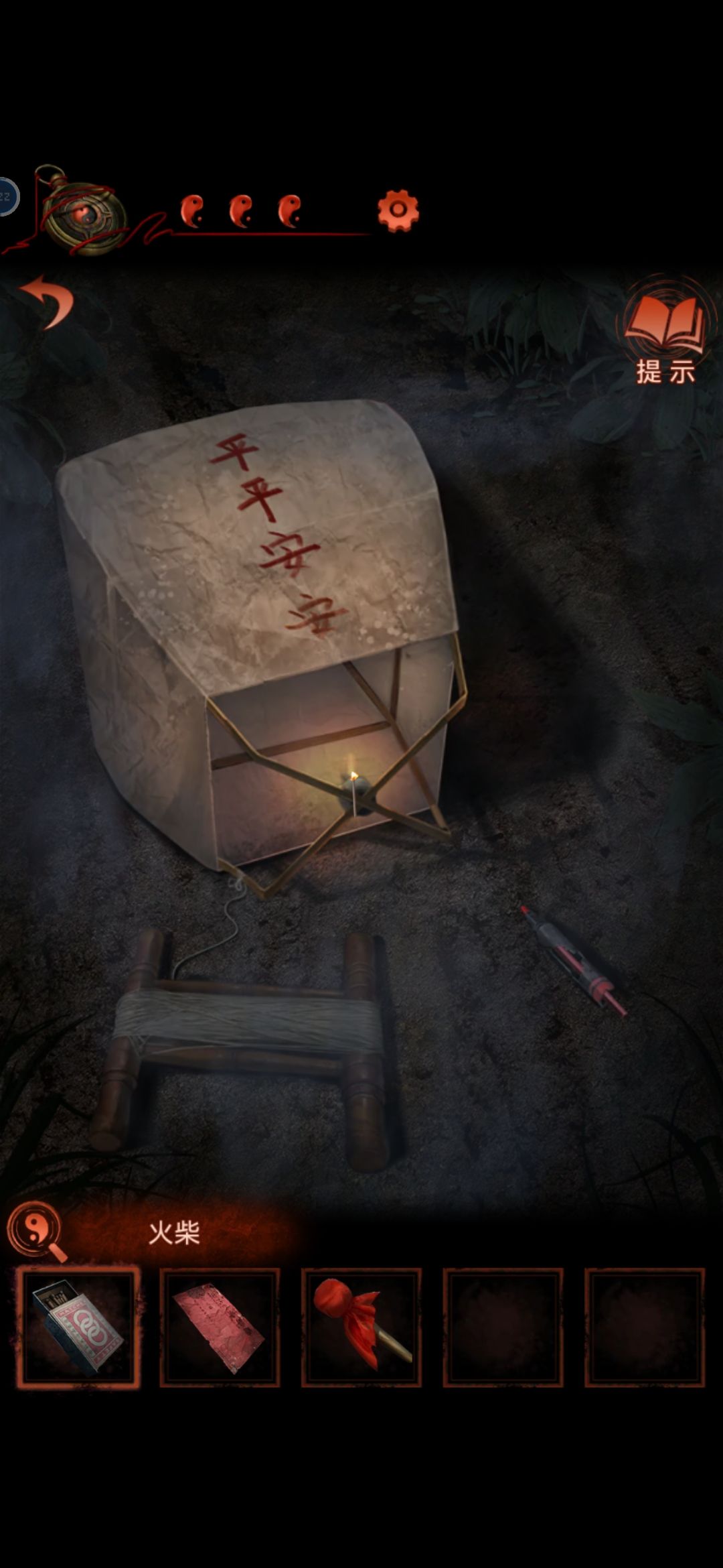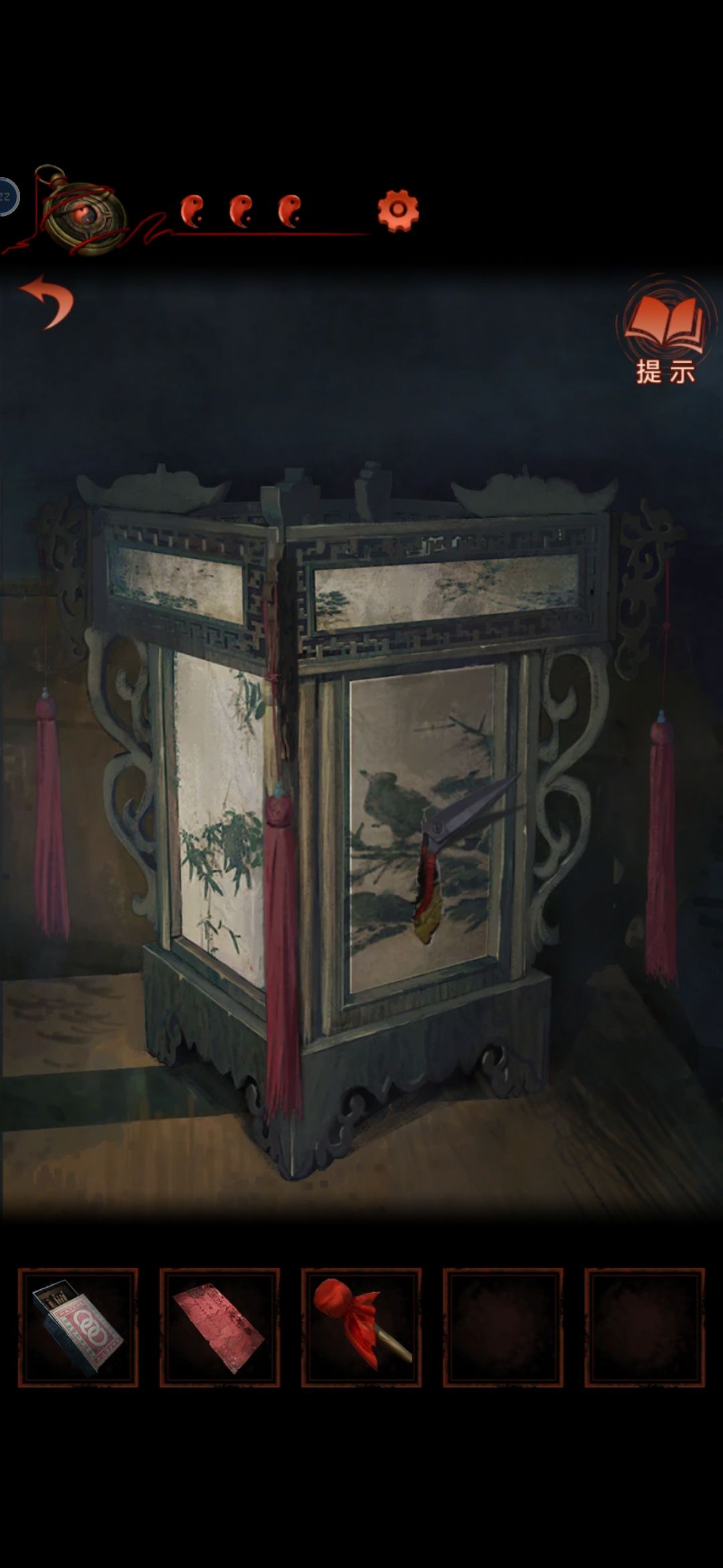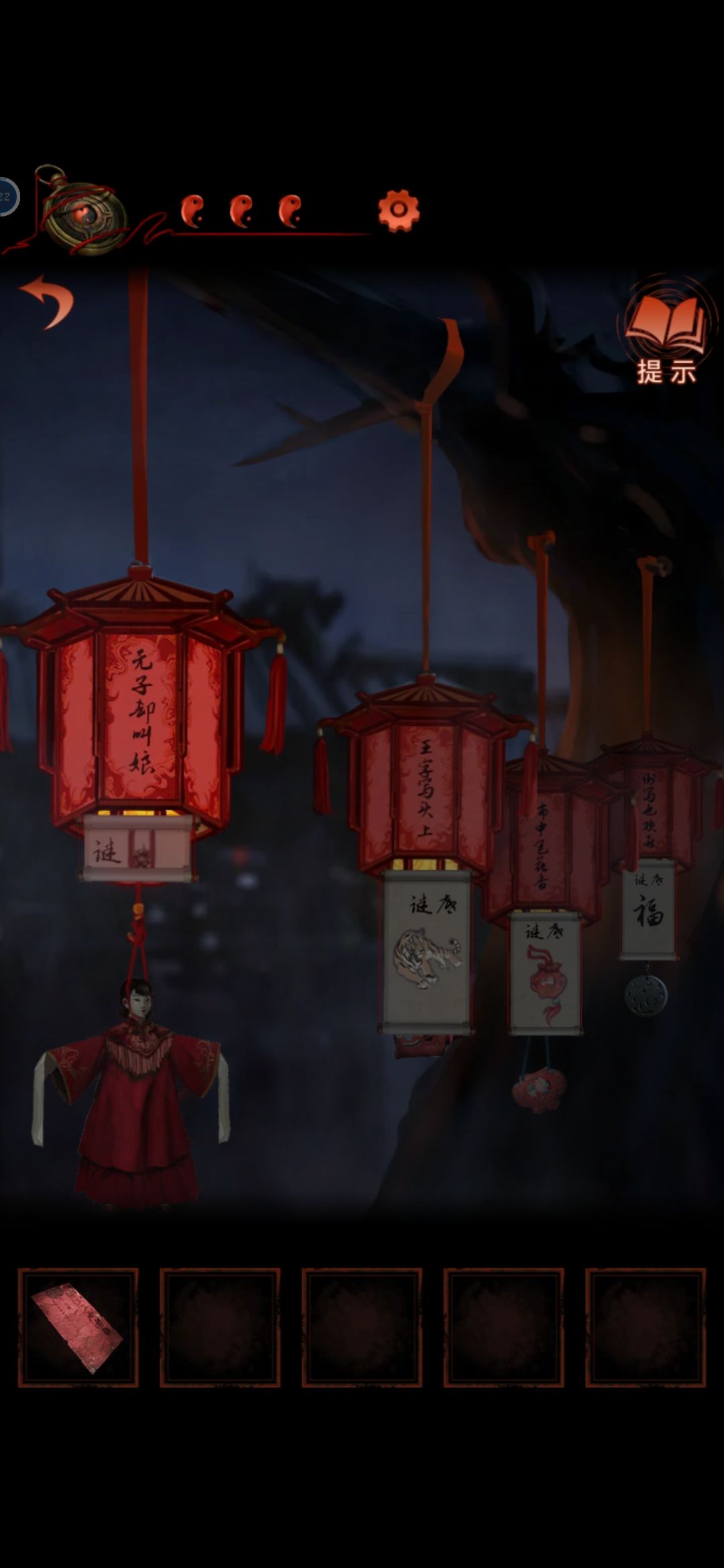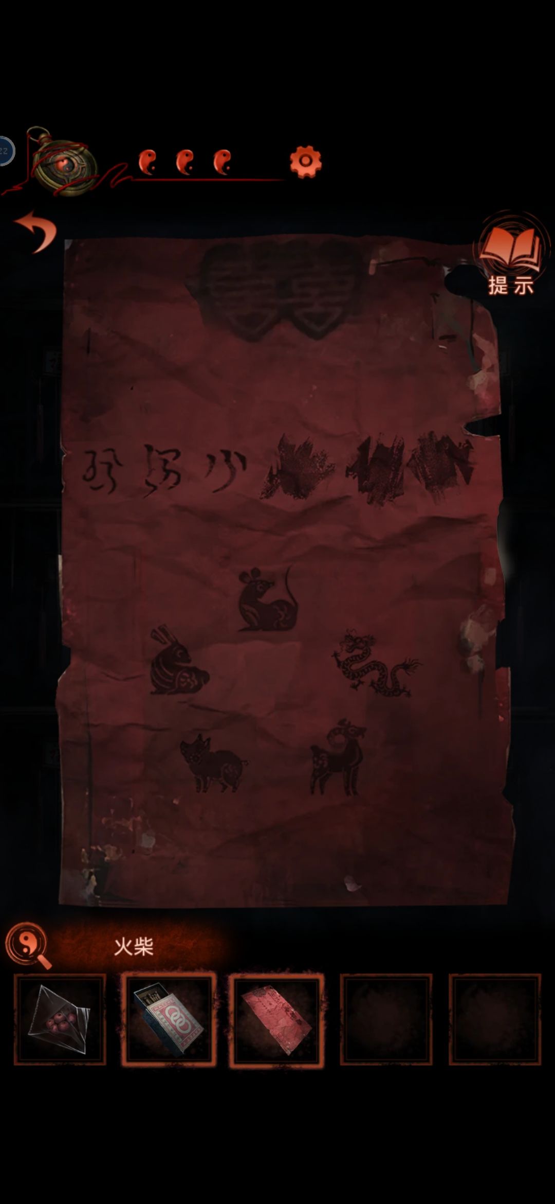 把龙放在中间的灯笼上,从轿子里得到请帖和绣花鞋,根据请帖背后线索,灯笼下面得到火柴点亮动物,获得老虎布偶