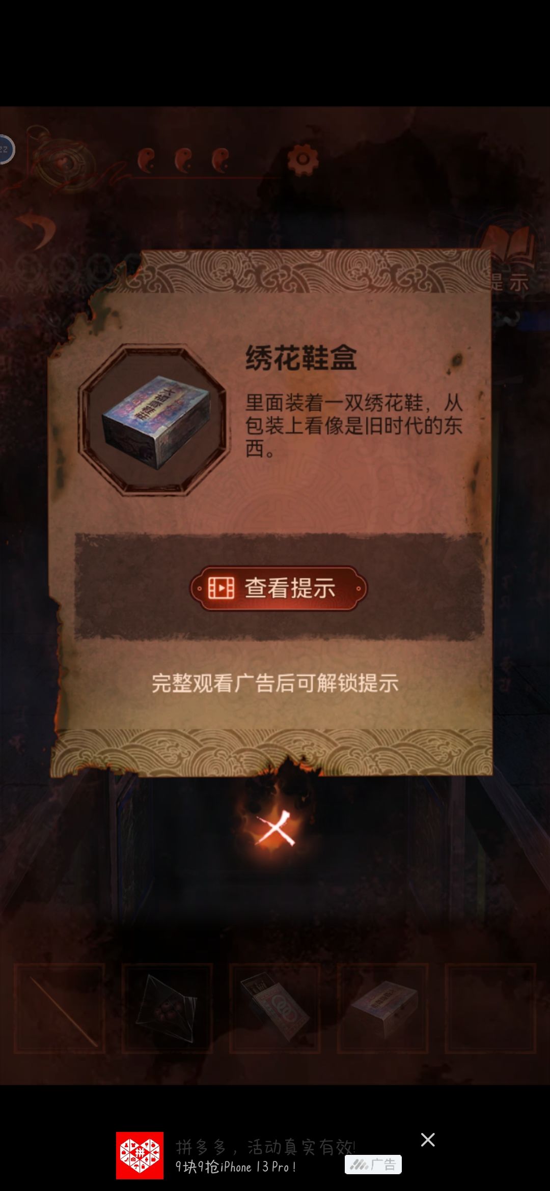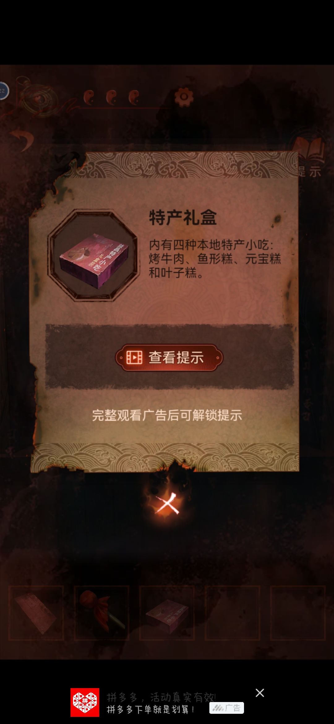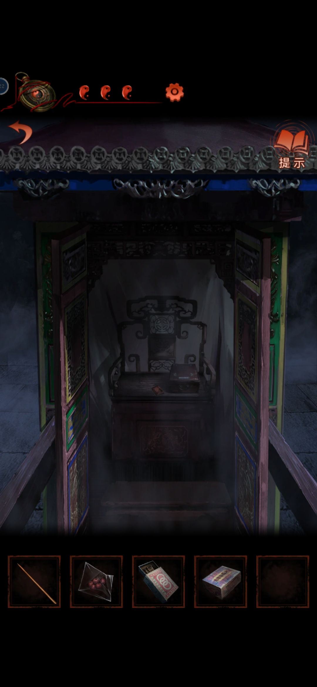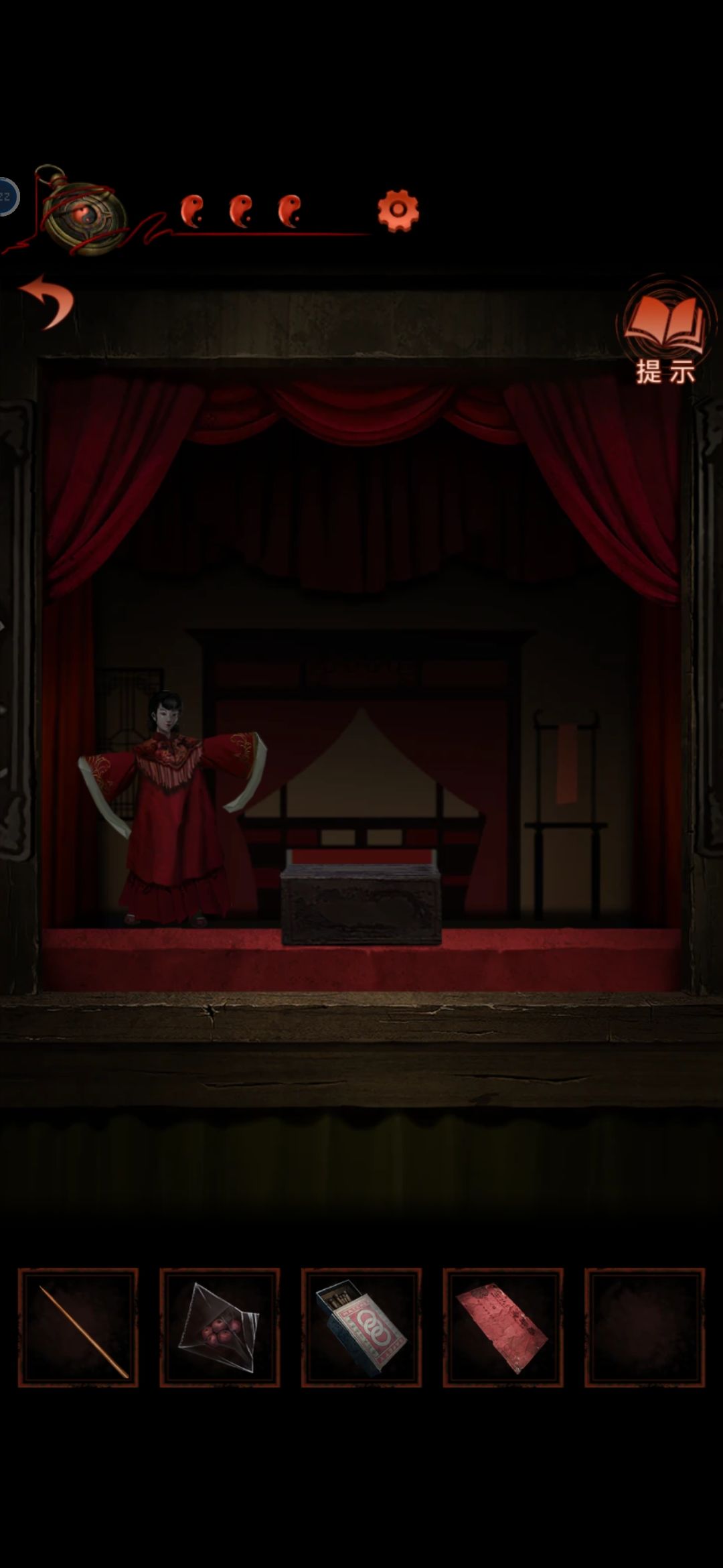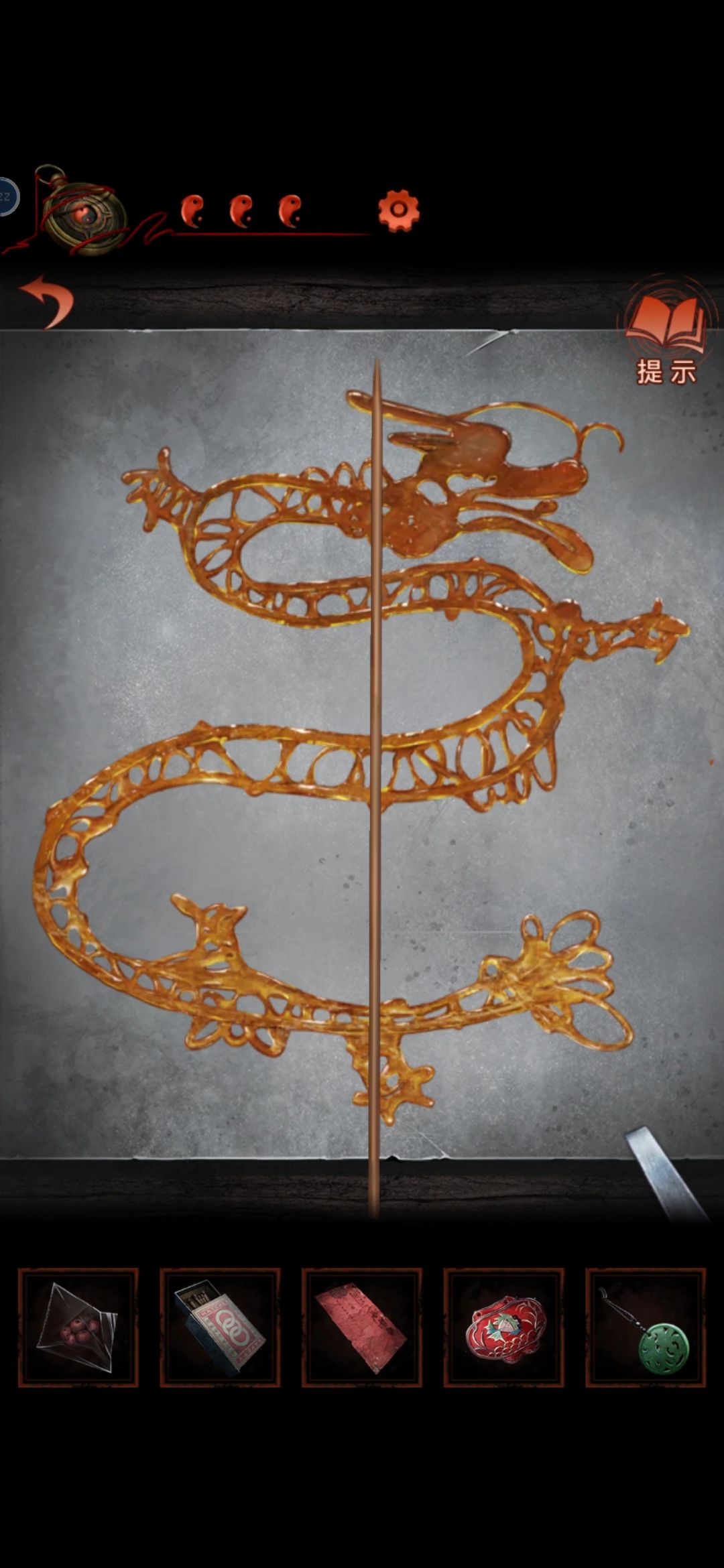 把龙放在中间的灯笼上,从轿子里得到请帖和绣花鞋,根据请帖背后线索,灯笼下面得到火柴点亮动物,获得老虎布偶