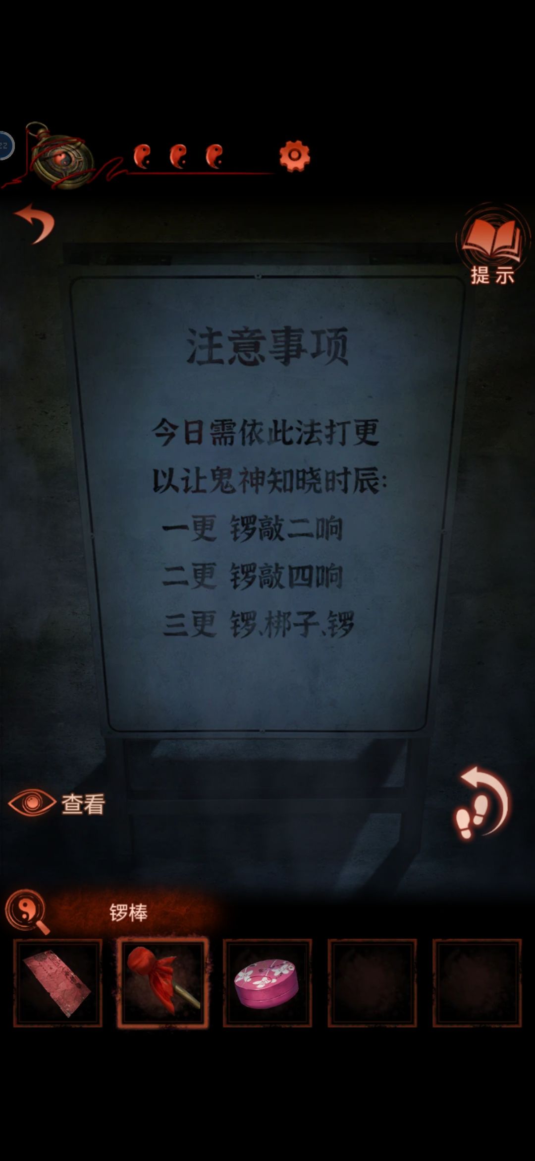 敲锣四声 回到二更把胭脂盒给到木偶 获得梆子,梆子给打更人,根据之前的锣,梆子锣,来到三更