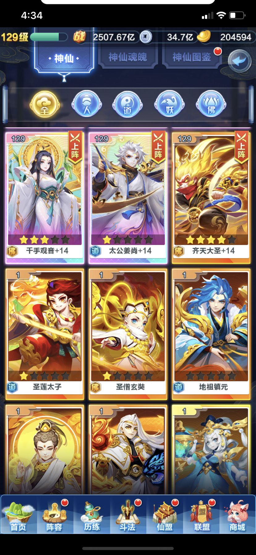 2.上阵神仙升星。上阵神仙可以通过升级、升星、进阶、飞升、突破等等方式提升战力。这里要提到的是没上阵的神仙也是可以升级进阶的,但是没上阵的神仙除了升星和升级图鉴外,其他升级进阶飞升都无法提供战力。神仙品质越高,升级升星进阶飞升突破增加的战力越高,而且是实打实的战力,不是虚战,至于虚战是什么,接下来我会接着介绍。