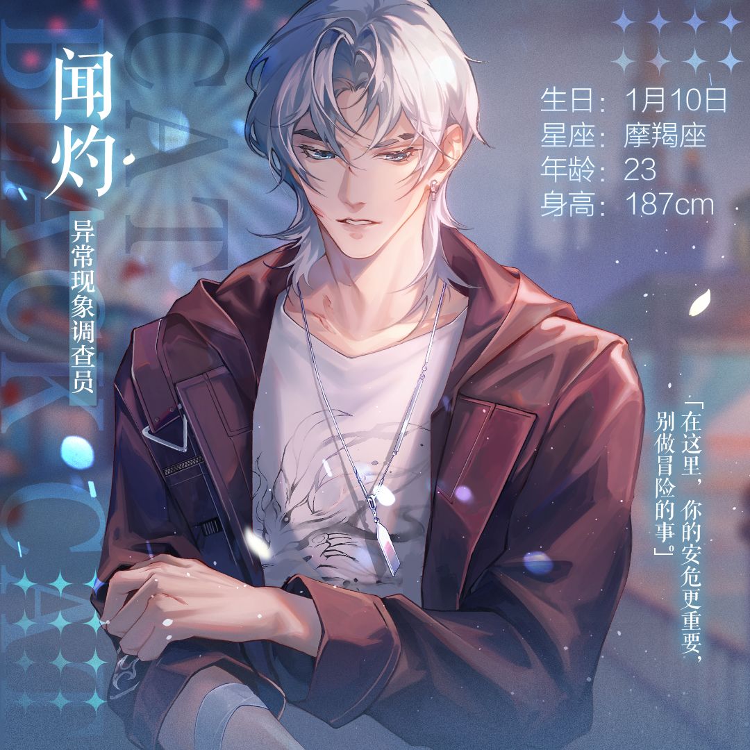 遣灵署的调查组成员,一头银发似乎是他的专属标志。与危险相伴是他的职业日常,雷厉风行的办事风格也让他收获同行或赞叹或畏惧的眼神。无法言说的过往,是支撑他在这座城市解决怪异事件的动力。