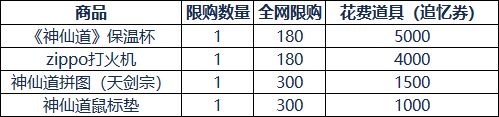 本次活动将有四种实物周边进行兑换,分别为:“神仙道×非物定制保温杯-「扶摇云上」”、“神仙道×Zippo定制打火机”、“TOI拼图”、“新版鼠标垫-「金龙衔彩庆周年」”兑换的道具名称为:追忆券;追忆券获取方式:在夏日充值回馈活动期间内可通过累计充值、参与冰爽夏行等方式来获取对应的追忆券;