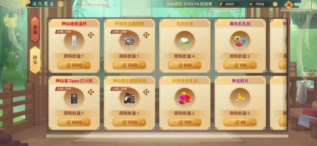 值得一提的是,在珍宝商店中除了诸多珍稀道具外,还会限时限量上架神仙道保温杯、神仙道Zippo打火机、天剑宗主题拼图、神仙道主题鼠标垫等《神仙道》联名实物奖励!!使用对应数量的追忆券即可兑换哦~!各位喜欢的仙友可千万不要错过~