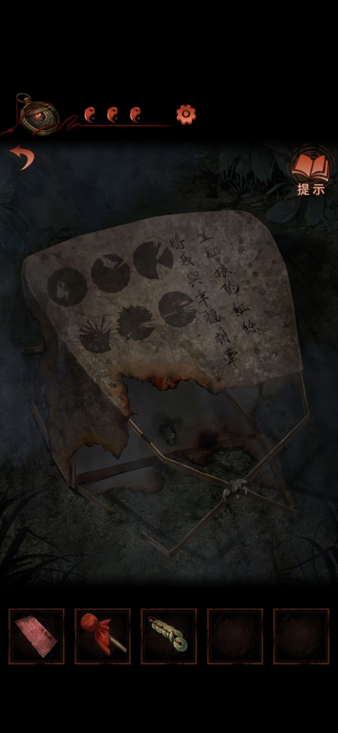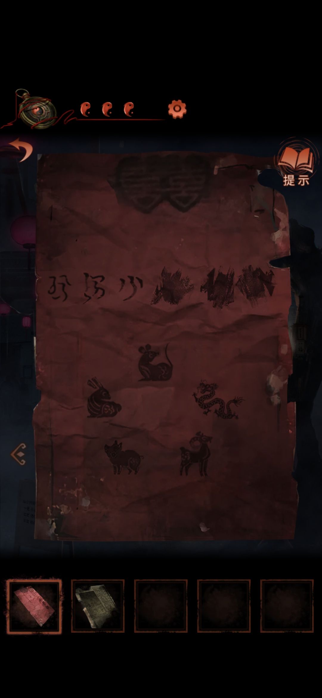 点击左场景小庙旁黑白纸人,[锣棒]敲锣两下,进入一更场景