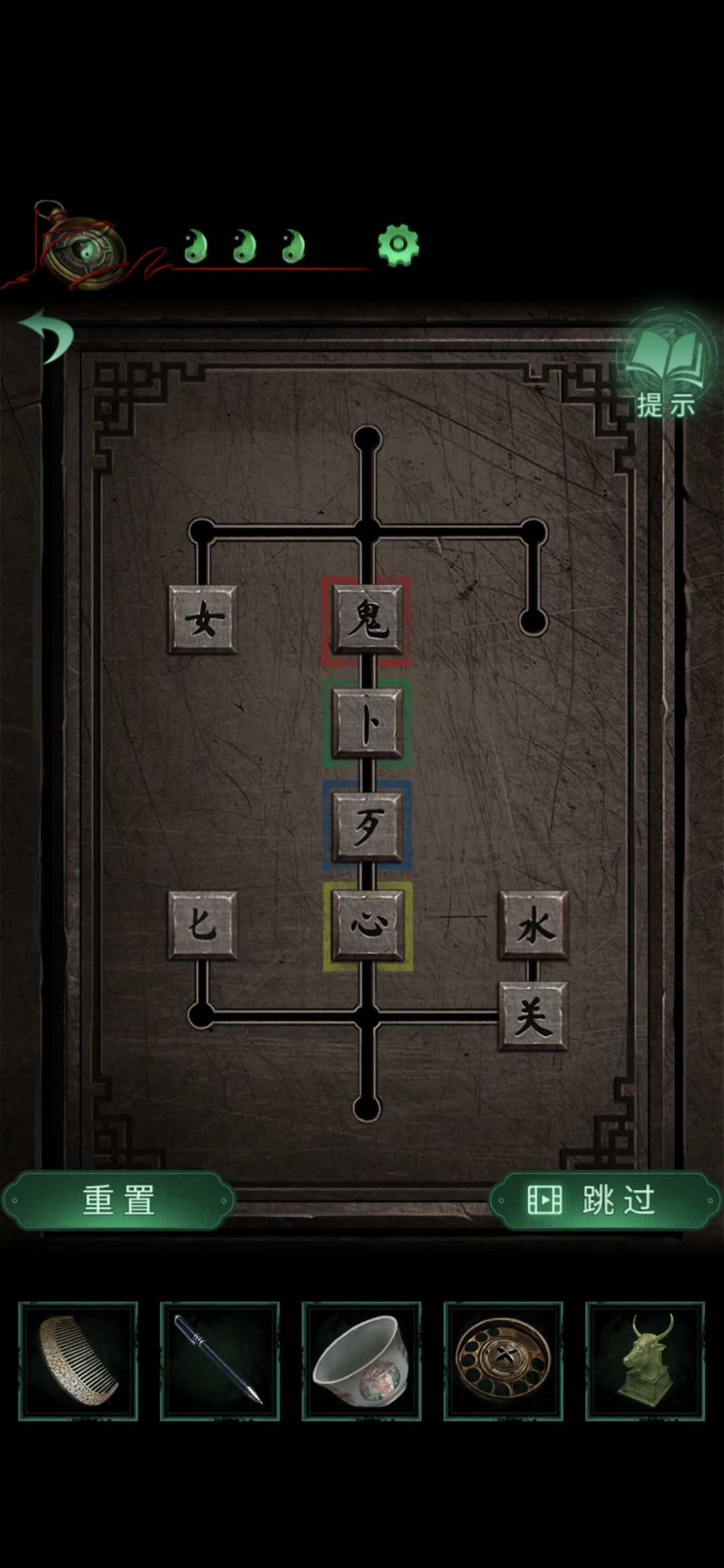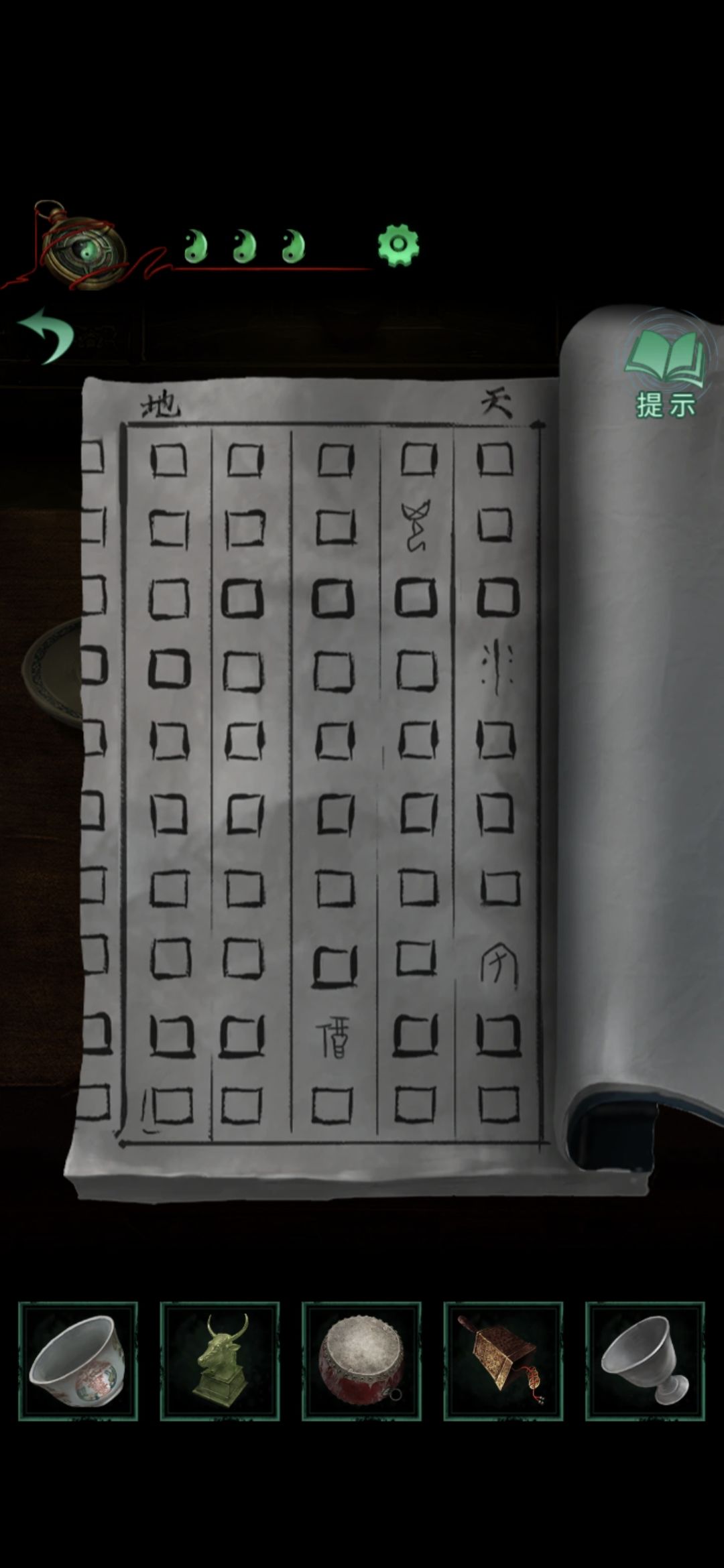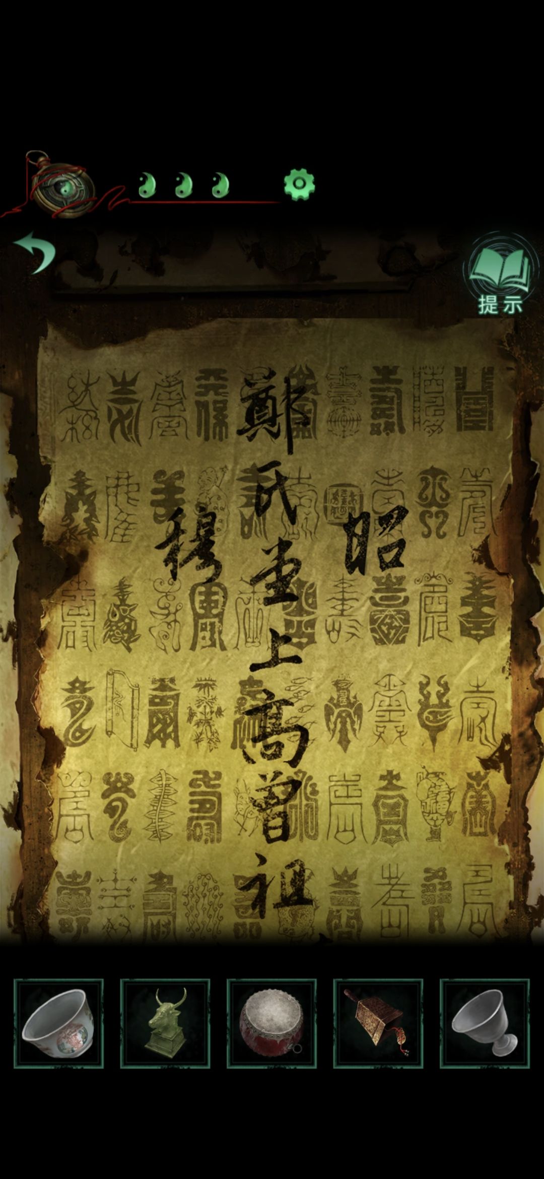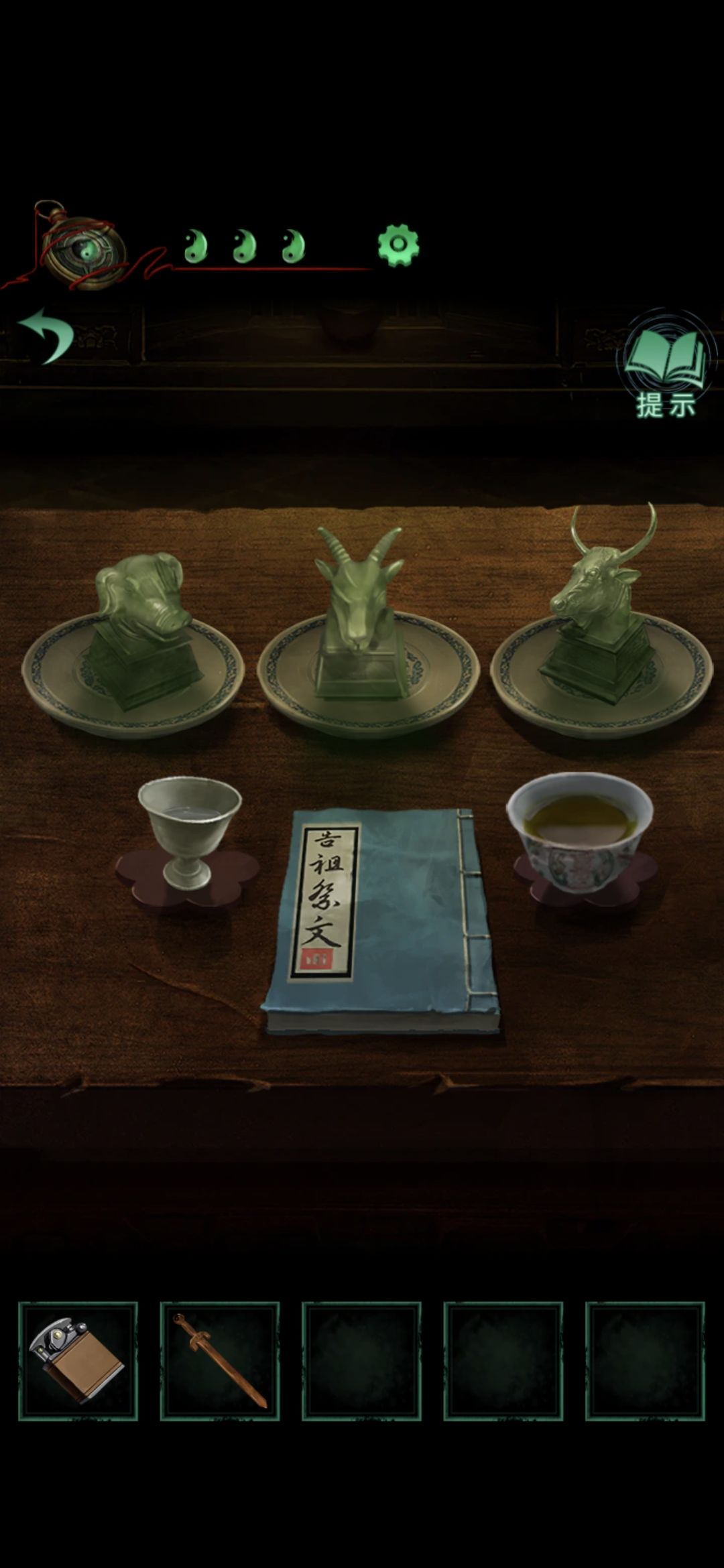 到主屋,阅读桌子上的书,观察墙面百寿图,打开左侧茶柜密码锁,获得[羊头雕像]和[猪头雕像]