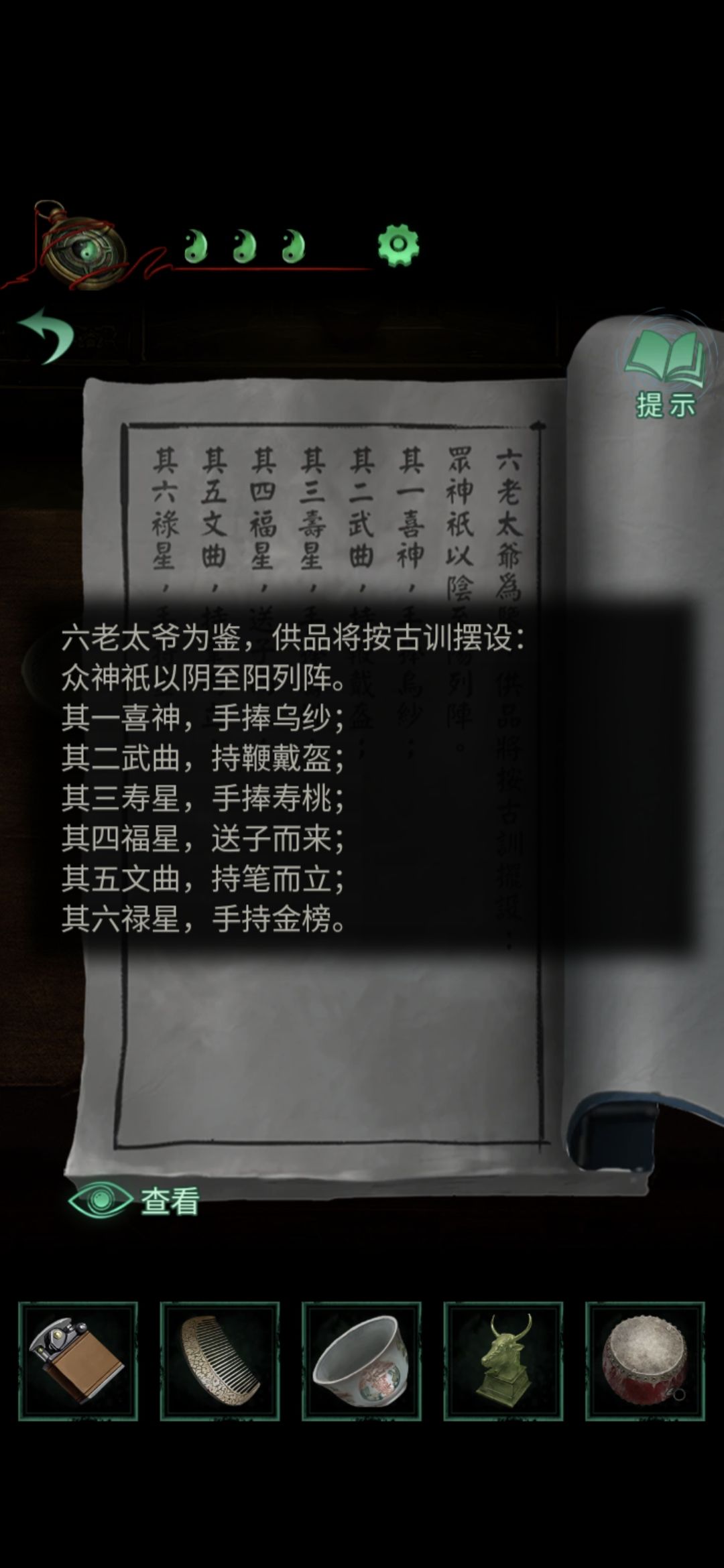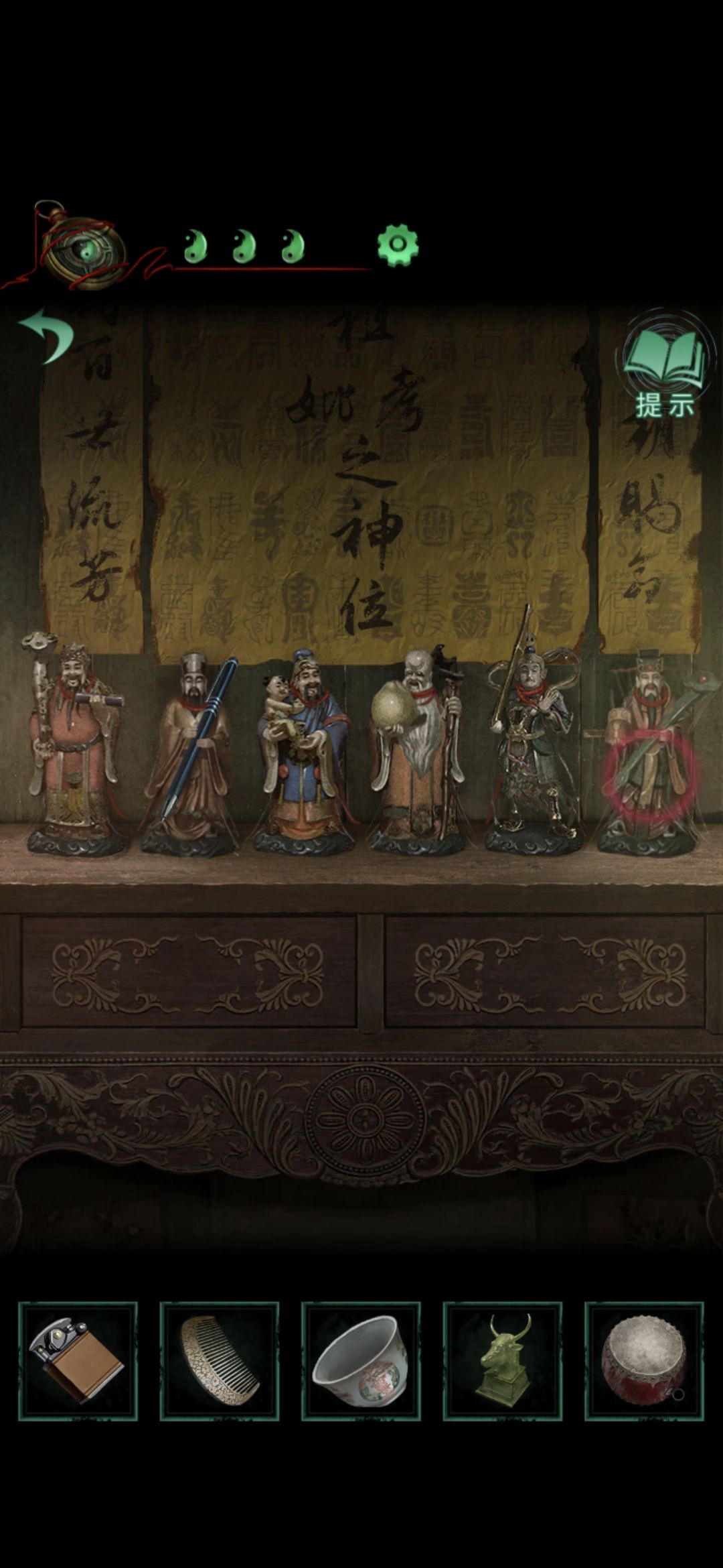点击百寿图下神像,将圆珠笔交给文曲星,按照书中提示顺序将神像排位 (左阳右阴)