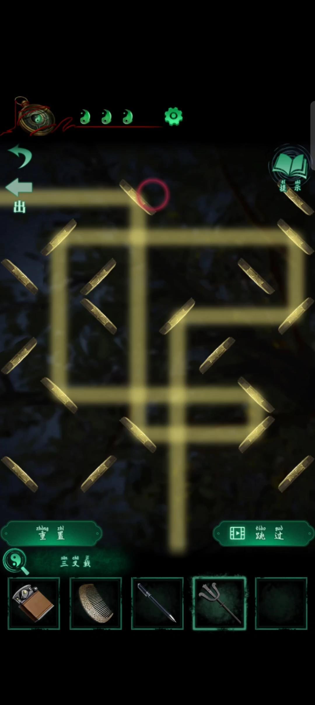 打火机点燃院子右侧蜡烛,[三叉戟]点击上方铜镜,完成反射迷宫