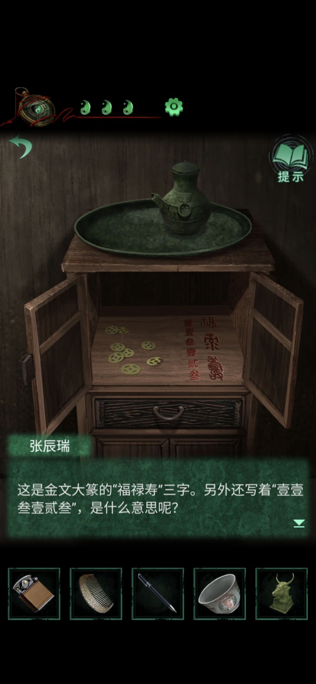 到侧边棺材房间,依次点击棺盖(112132)[福 福 寿 福 禄 寿],棺盖打开,获得[空酒杯]