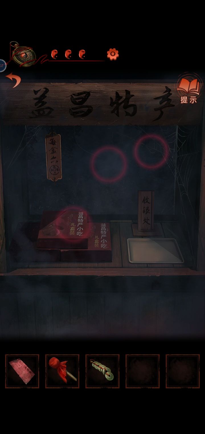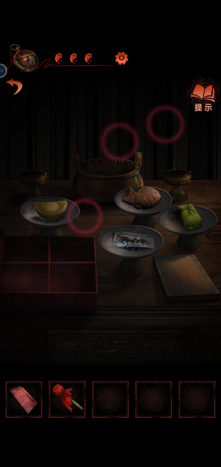 14.把特产礼盒放在供桌上根据书上的线索摆放贡品,神像的嘴巴打开,得到红绳。