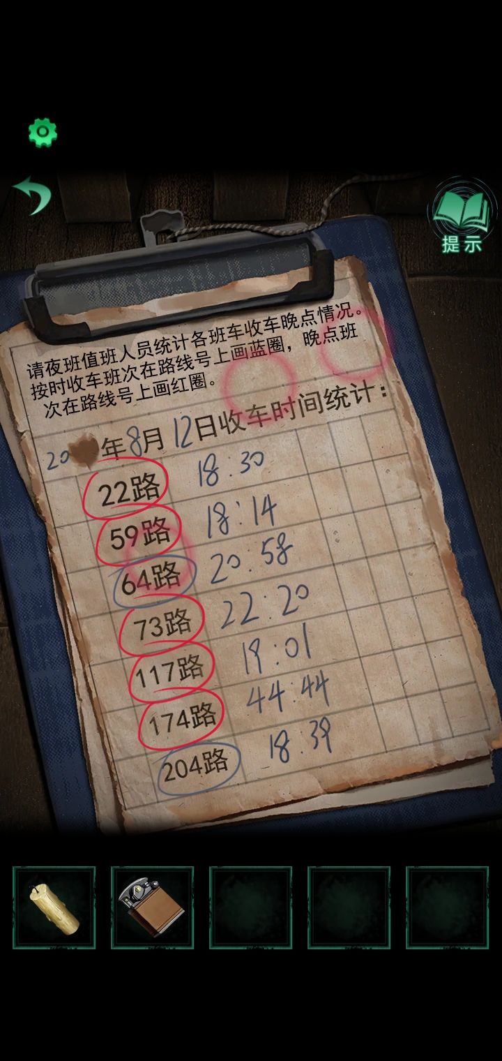 8.点击门旁边的椅子得到蓝色圆珠笔,根据公交运行时刻表计算:末班+单圈时间,与收车时间表进行对比 例:22路 17:30+50=18:20 最晚是这个时间收车,18:30与18:20相比还要晚了十分钟,所以是画红圈