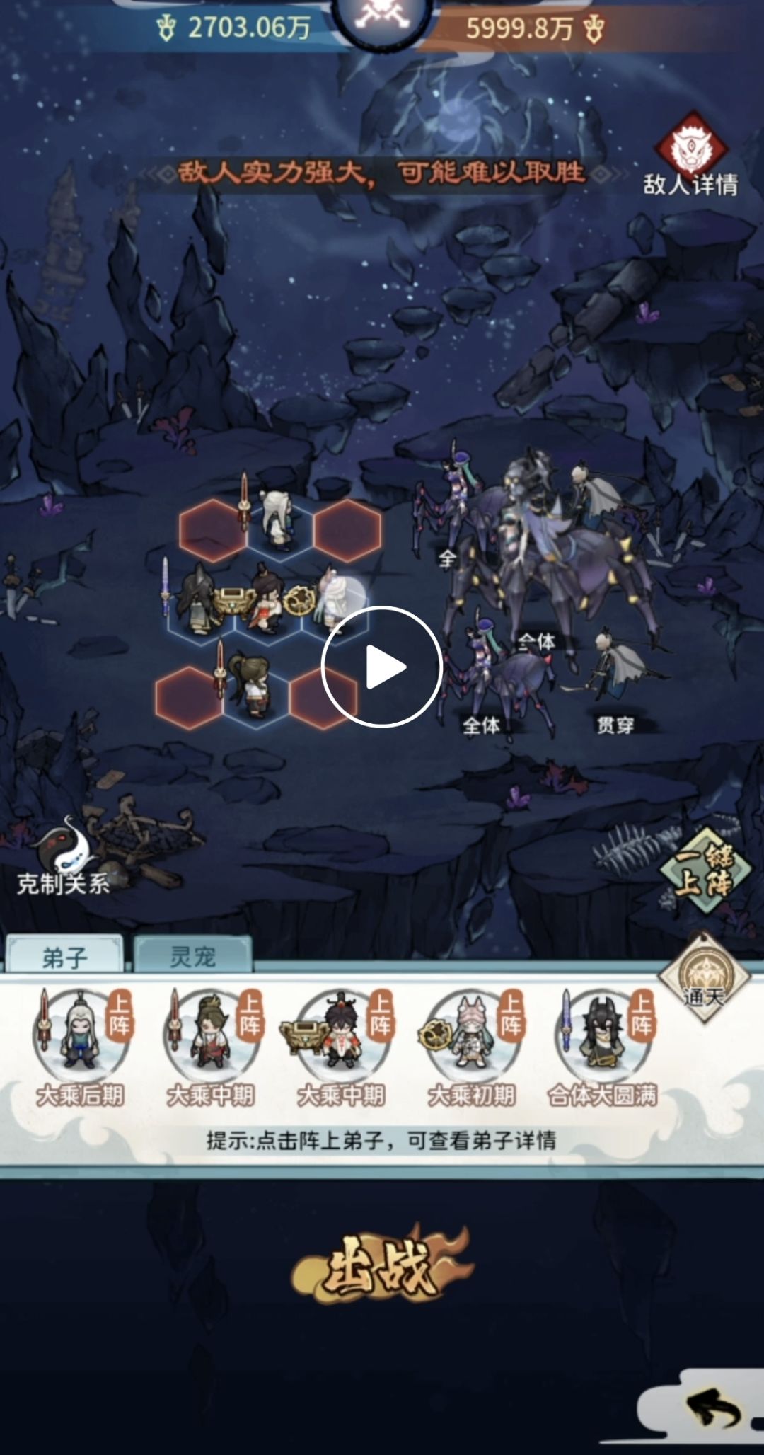 打法思路:小boss放毒后,一速通过土鼎清除自身debuff,两边主力依靠暴击回血,第二回合同时秒掉前排,第三回合穿透怪打完伤害后通过土印清除它身上叠加的buff,这样第四回合穿透怪加小boss就无法秒掉我方弟子,从而顺利打掉穿透小怪,接下来再打boss。