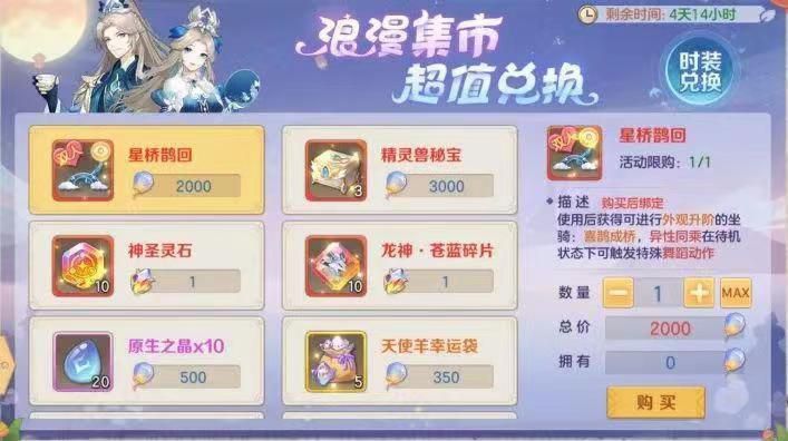 浪漫集市,什么星桥鹊回、朝夕献礼啥的,我穷买了几个龙神碎片想凑碎片兑换龙神苍蓝。