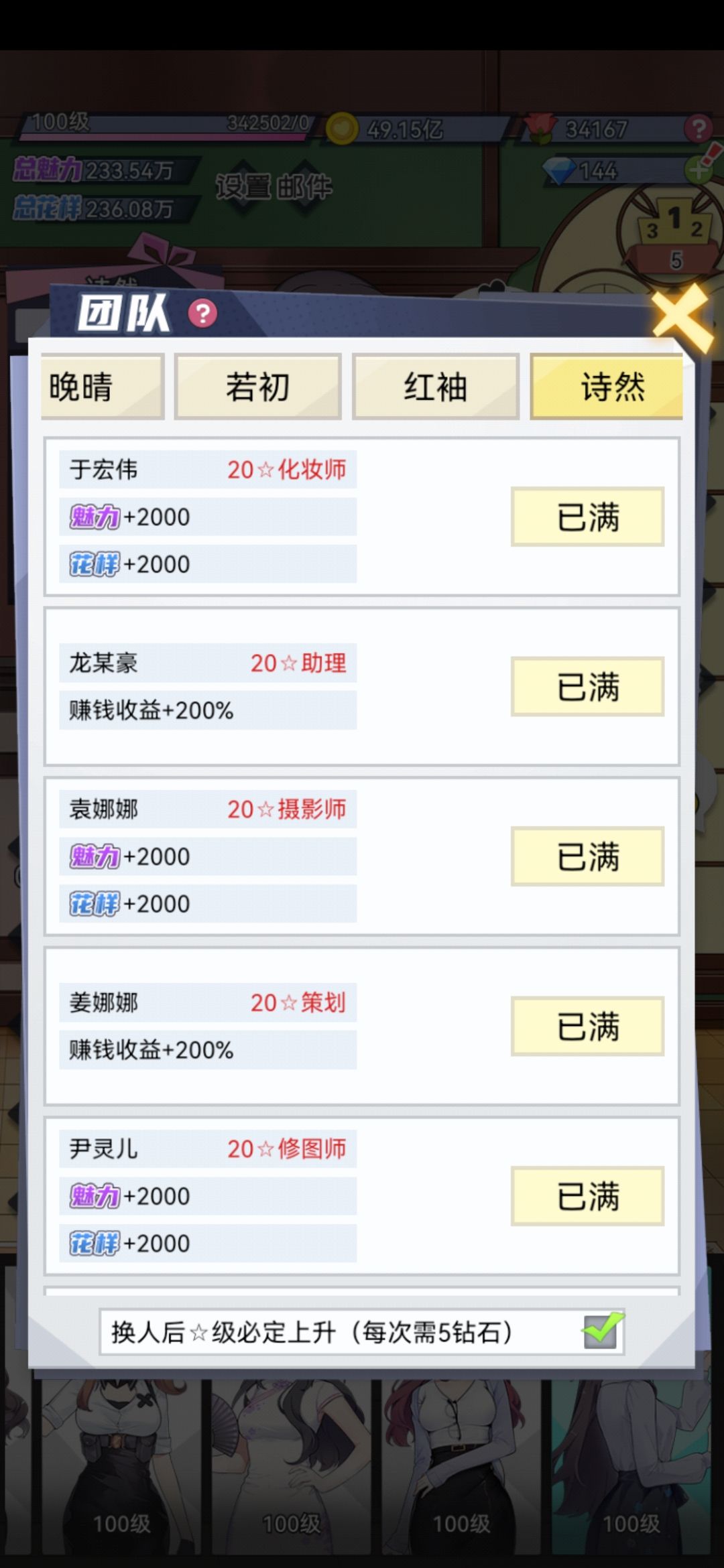 4、团队里优先用钻石升级赚钱百分比成员(建议每次都花钻石保底,这个升满要很长时间)