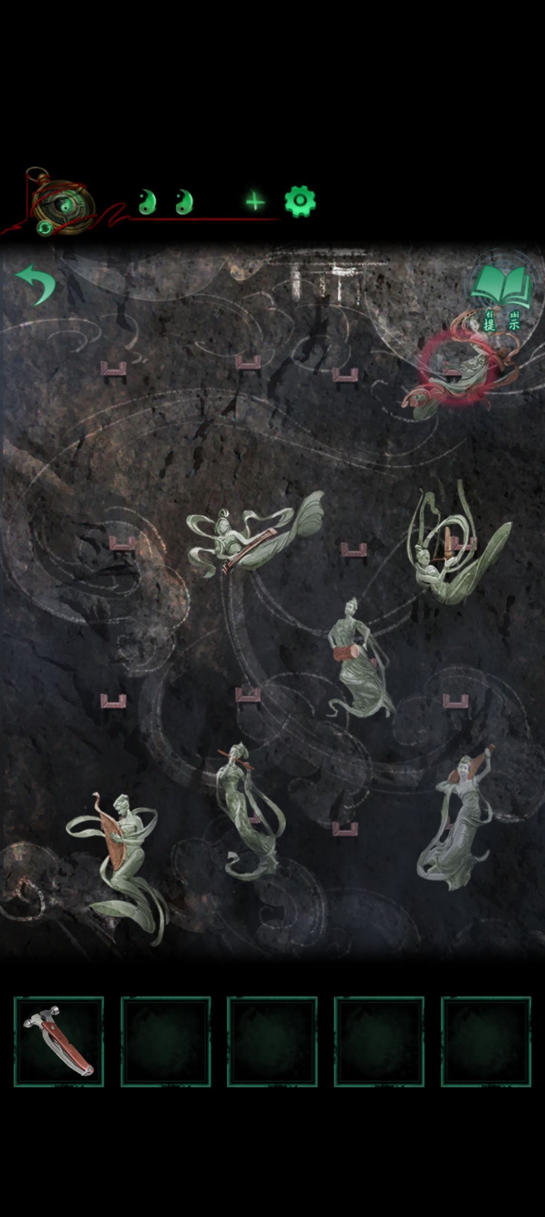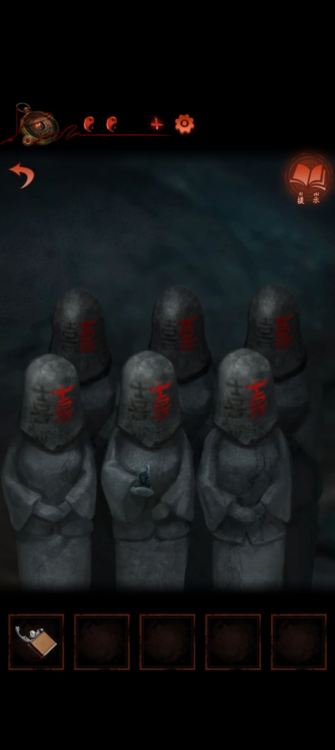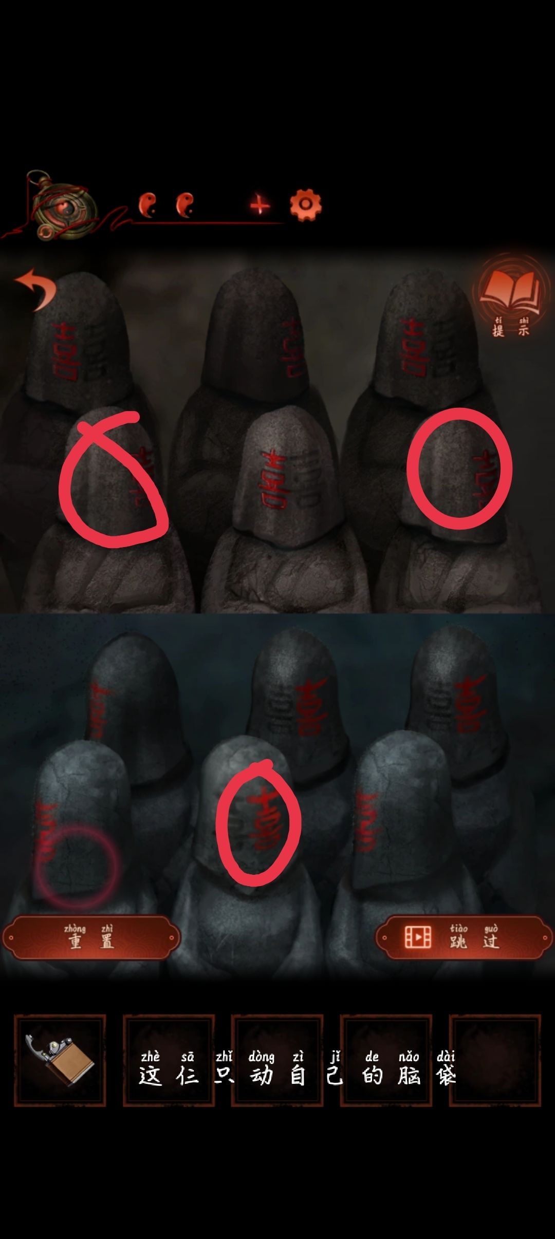 回到女方再次转动阴阳鱼接着点左下方五个石人然后从上往下先上面都正脸再下面正脸再回到上面正脸再回到下面正脸结束