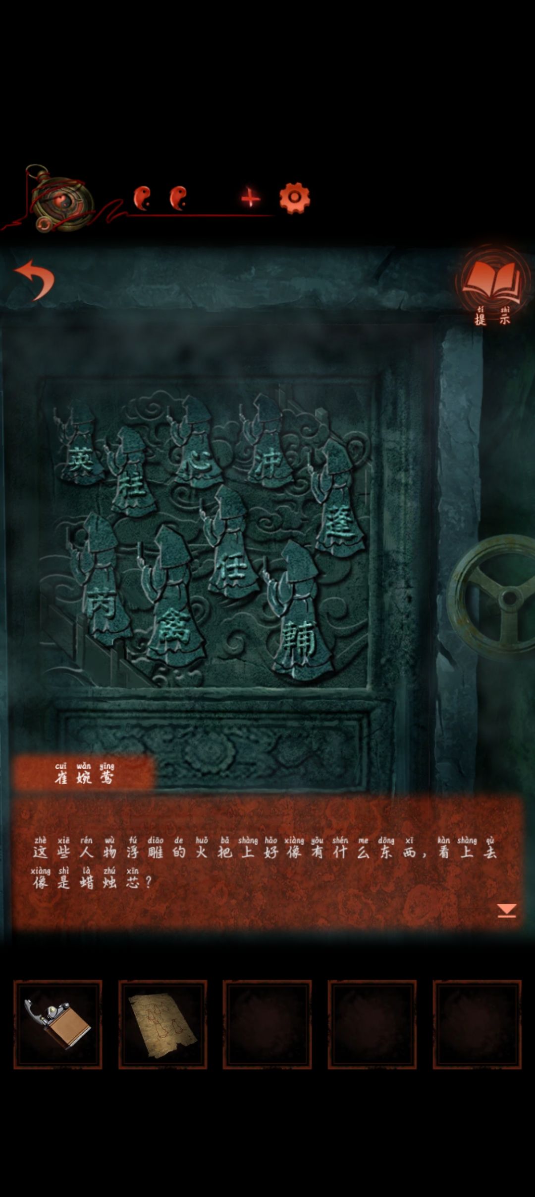 进门查看浮雕接着切换女方进门根据线索结合另一边浮雕用火机点亮浮雕