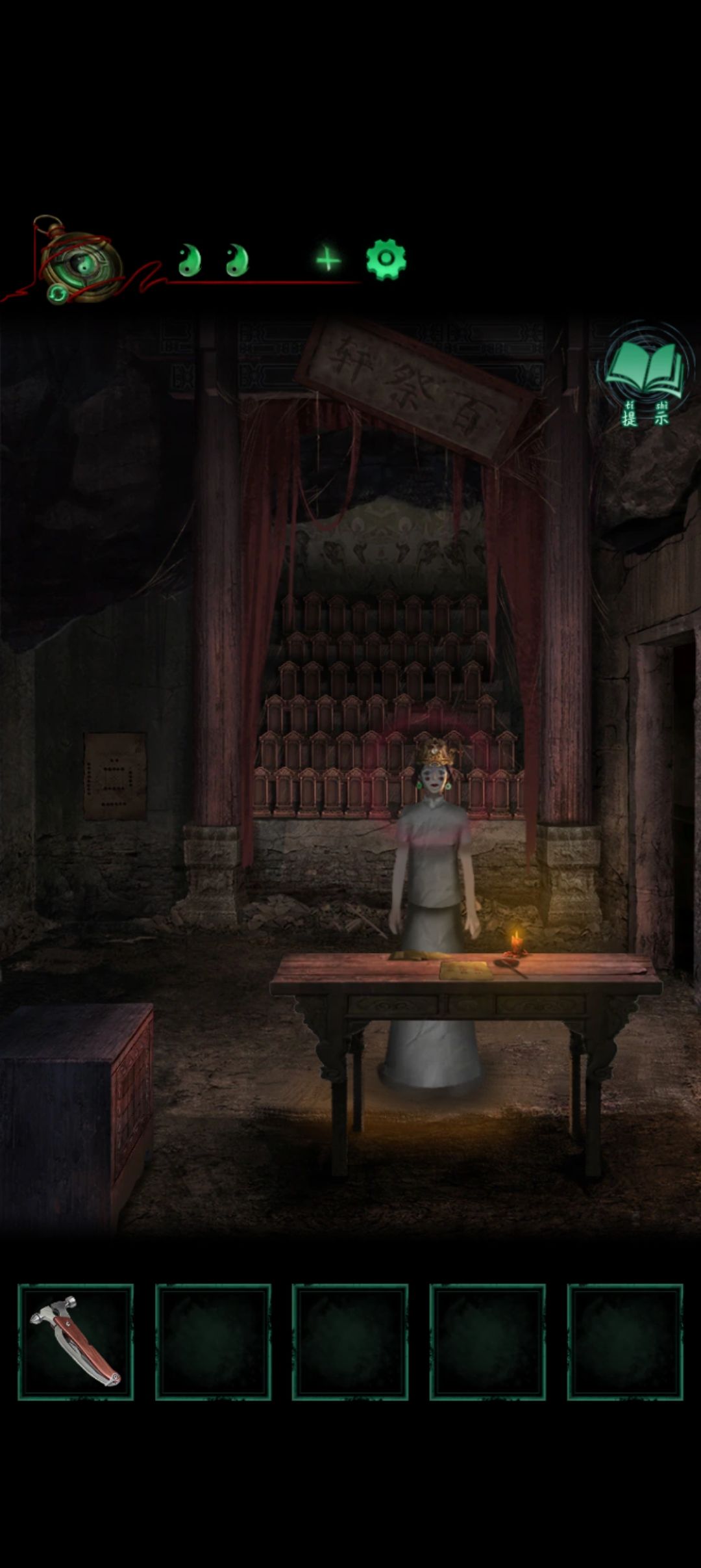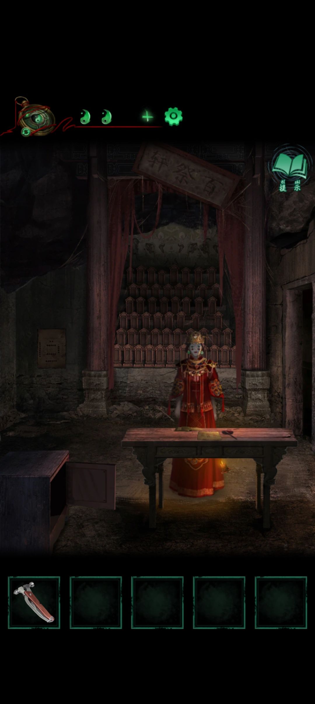 再切回男方进到百祭轩查看左边墙上河图点纸人面前桌子上的纸接着将耳环凤冠给纸人带上