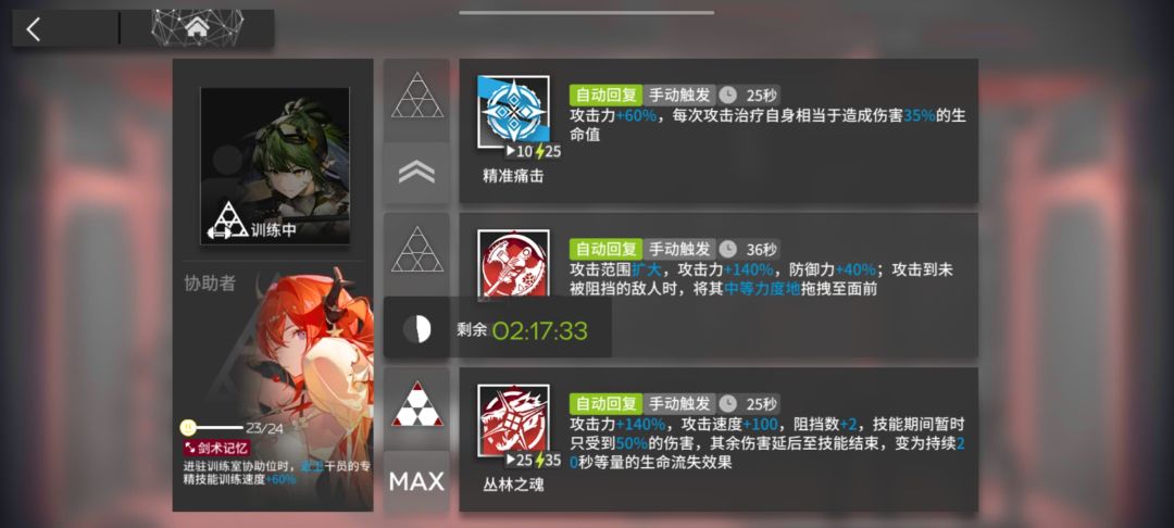③专精三 专精三阶段白值24小时,触发艾丽妮技能折至12小时。此后更换为百炼嘉维尔(专三效率+95%),专精三花费6小时9分钟。