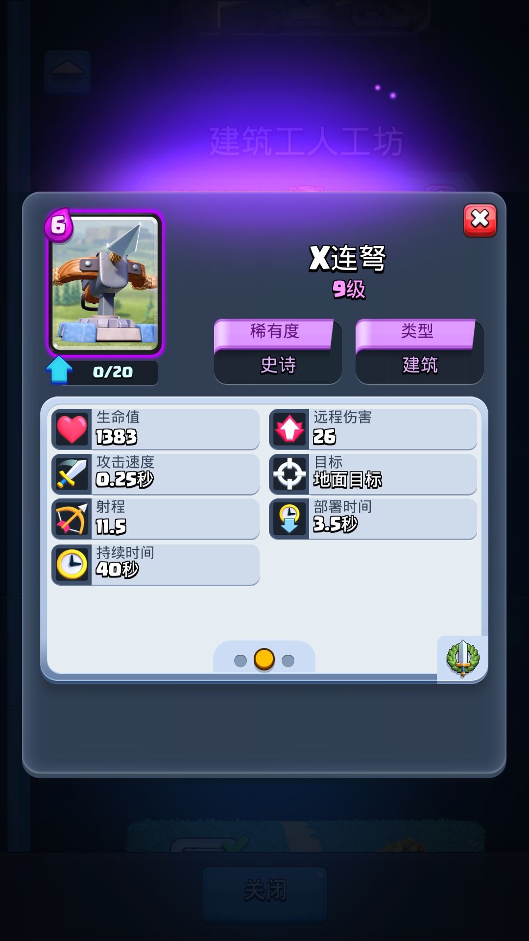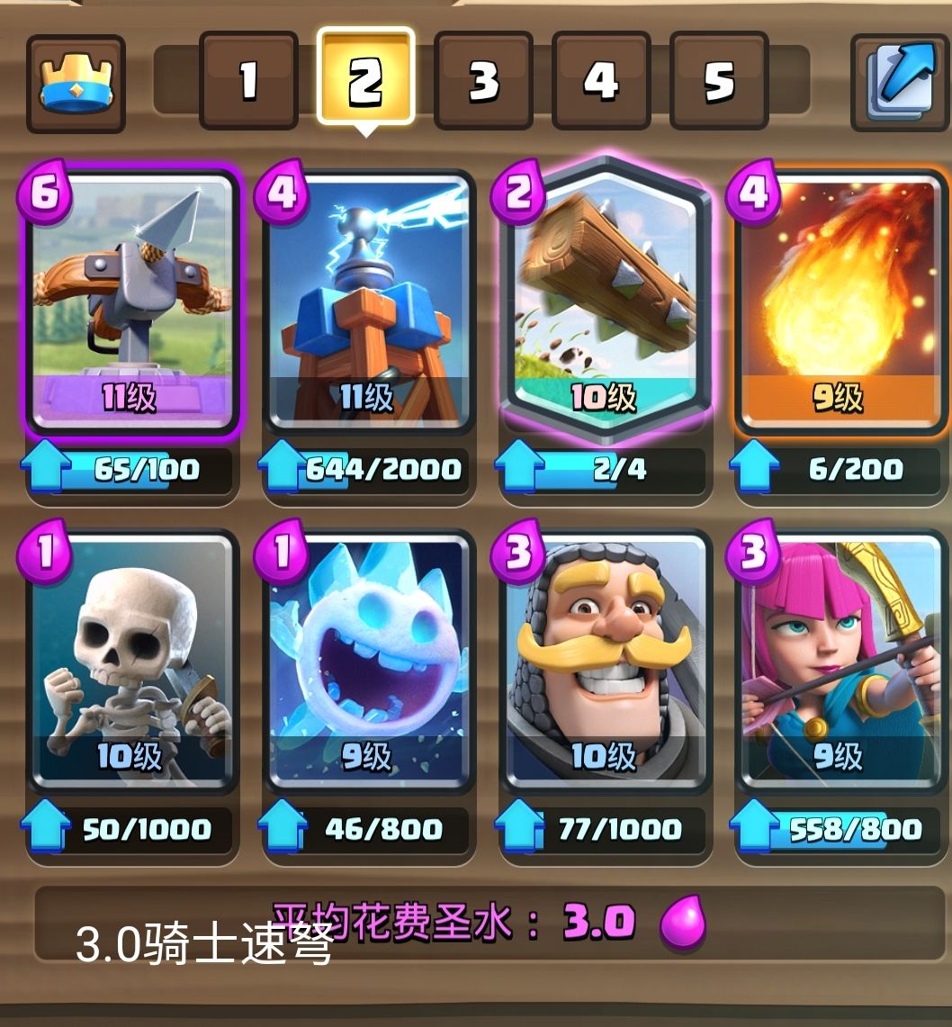 x连弩,头号进攻核心,绝对c位。立在我方半场就可以射到对方公主塔。但3秒的部署时间以及比起它的6费而言脆弱的身板使我们绝对不能开局无脑下弩。一定要在有保护的情况下下弩。单倍不赚5费/对方卡组拿弩一点办法没有的情况下不要进攻弩。假如对面是地震猪或者黄家驹那最好直接不立进攻弩。如果算不清楚什么时候赚了5费以上,那还是最好不要立进攻弩。立防守弩就行。 对方沉底大费之后可以直接换路进攻弩(石头人,女巫,电车)这么换路基本上对面直接掉塔了。(但是不要莽,如果亏费那就最好不要这么干)