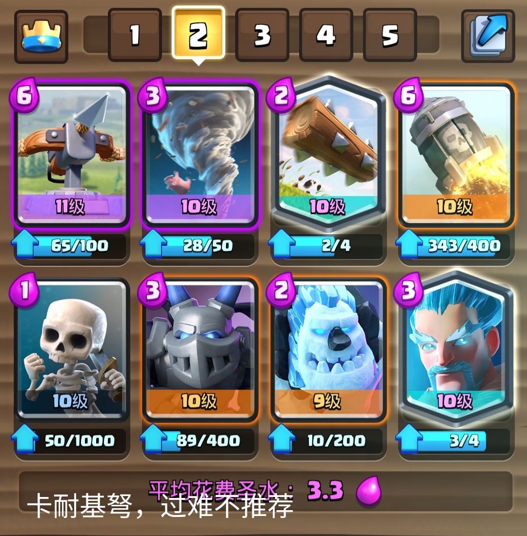 自闭卡组:指的是基本不与对手进行互动,进行大量防守,进攻没有特别多变化的卡组。代表有龙骑墓,3.3骑士桶,以及我们今天的主角:3.5冰法弩