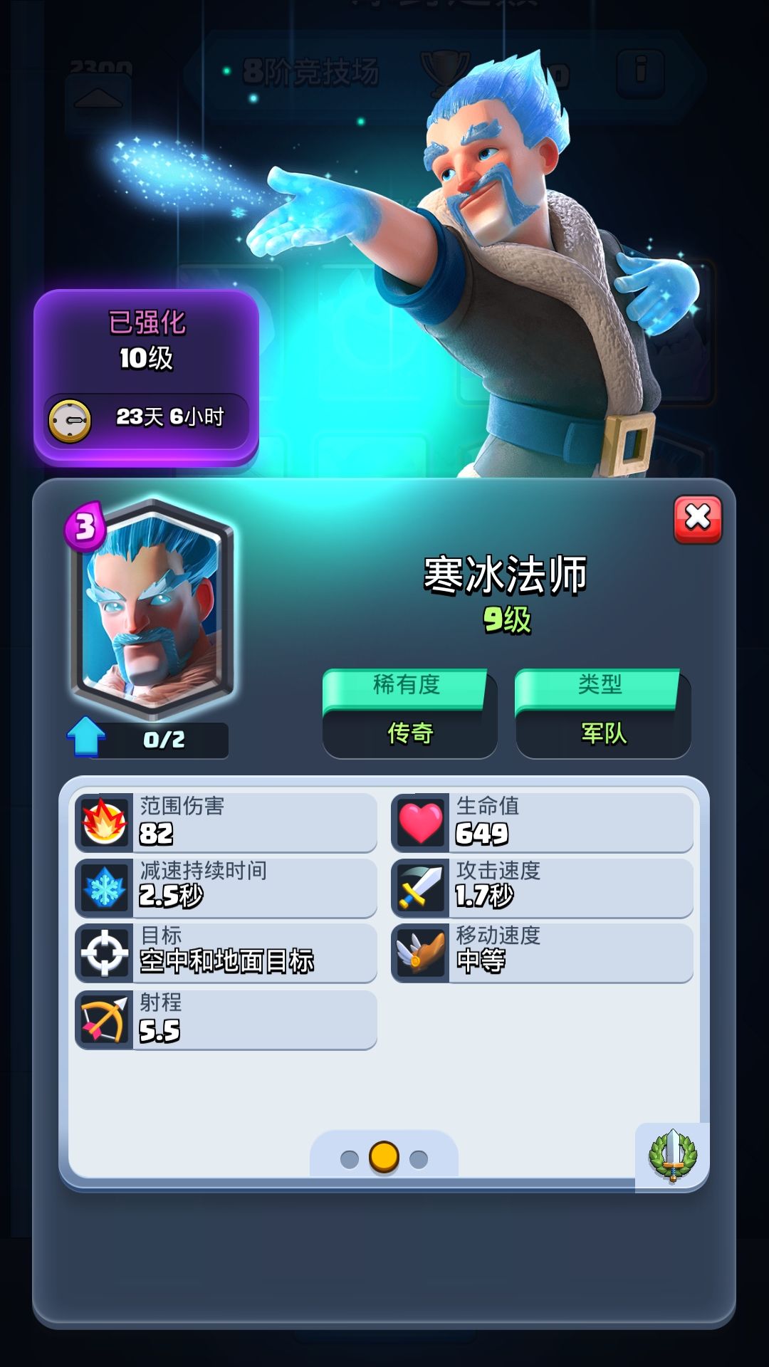 冰法:防守王。可持续向对手施加减速和减攻速。血量无法被火球和小皮卡秒杀,伤害低没事,反正我们只需要冰法来防守,我方半场有公主塔补伤害。骑士前面顶住,后面补个冰法,一般10费推进都能吃下来。