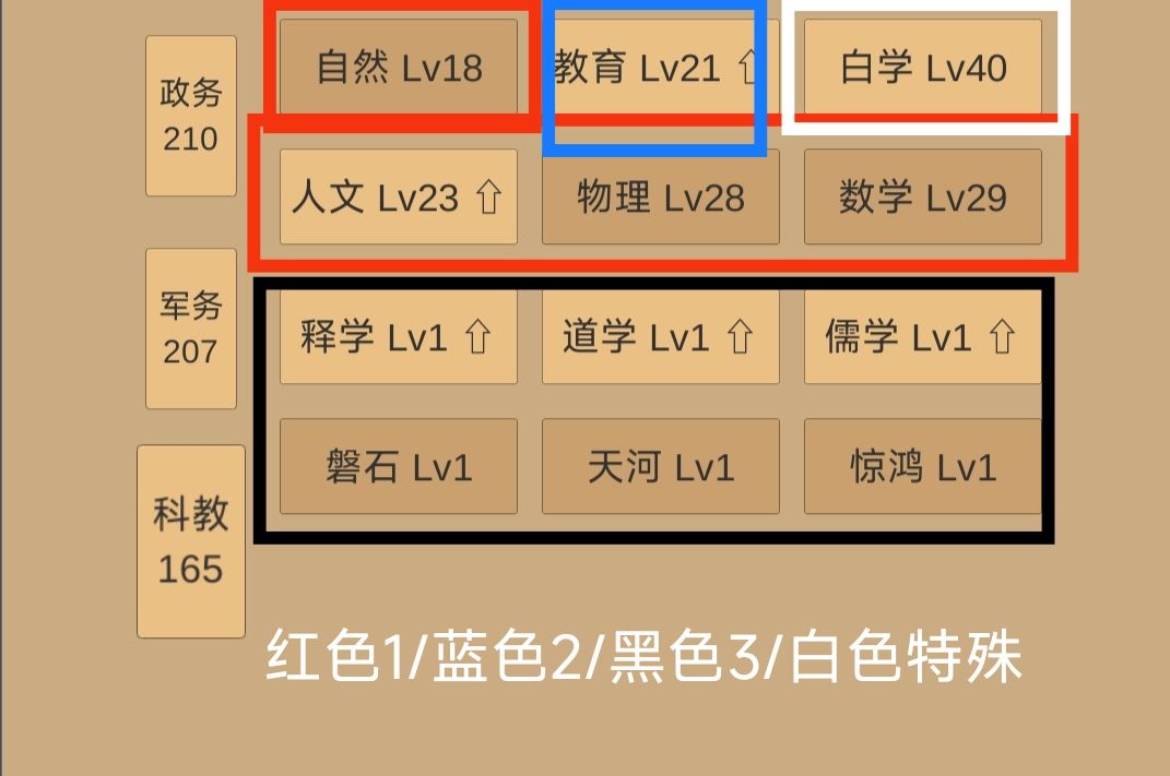 (建筑和物理的收益是最高的,但是一开始数学和物理费用较低,而且数学可以降低科技消耗,中期科技绝对是不够用,建筑等级远高于数学时可以优先升级数学。)
