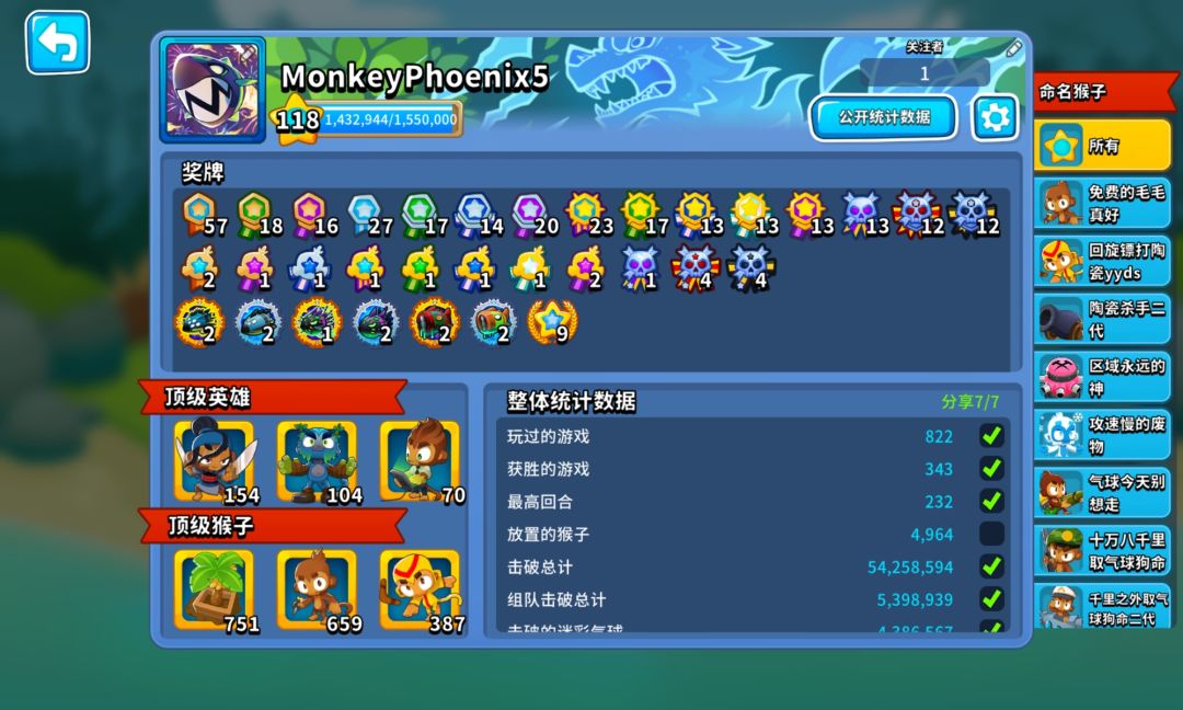 insta猴子:相当于一个收集图鉴,可以在不禁用力量的任意模式使用,当然一般是不舍得用的( 奖杯的使用 奖杯可以购买气球皮肤和一些头像一类的东西,打活动获得 一张地图每通过一个模式会多一个徽章,一张地图全徽章之后会变为金色边框,如果点击模式不退出游戏通关的话会变为黑色边框,虽然没有什么用)