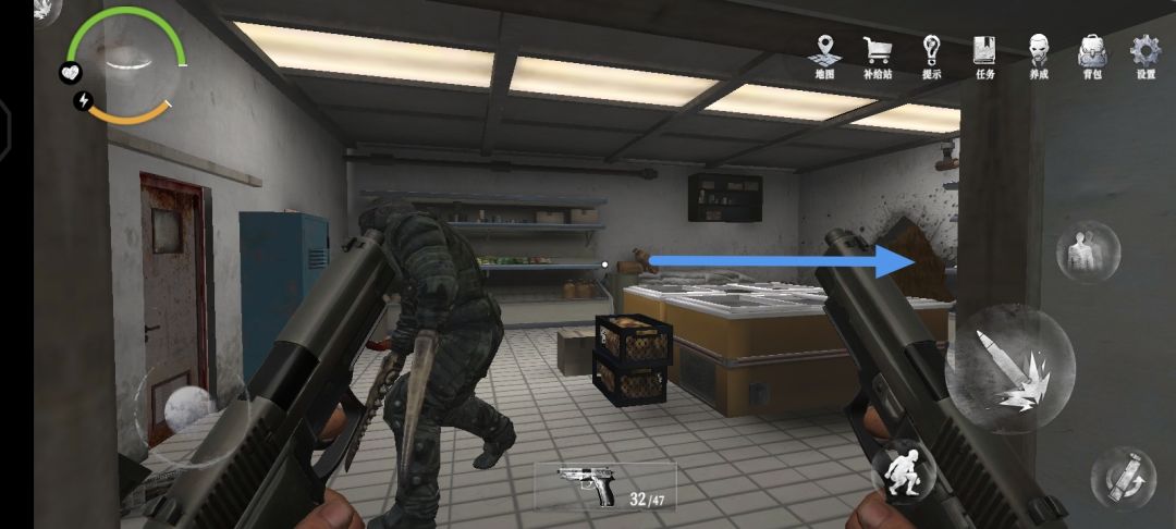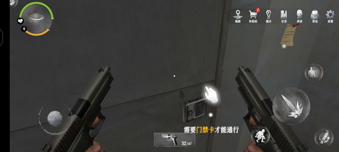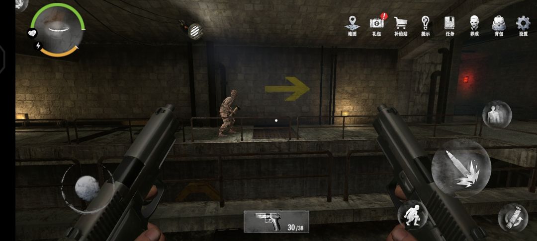 31.用门禁卡打开门后,会发现里面有一名防暴士兵,没有升级武器的玩家,建议跑到箭头所指的地方