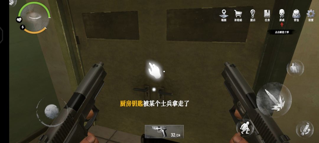 26.寻找防暴士兵的移动路线,找准时机进行背刺,可以通过扔砖头吸引敌人进行背刺,不过砖头的落地点不要离防爆士兵太远,这里由玩家自行发挥,处决防爆士兵之后,可以拿到一把厨房钥匙
