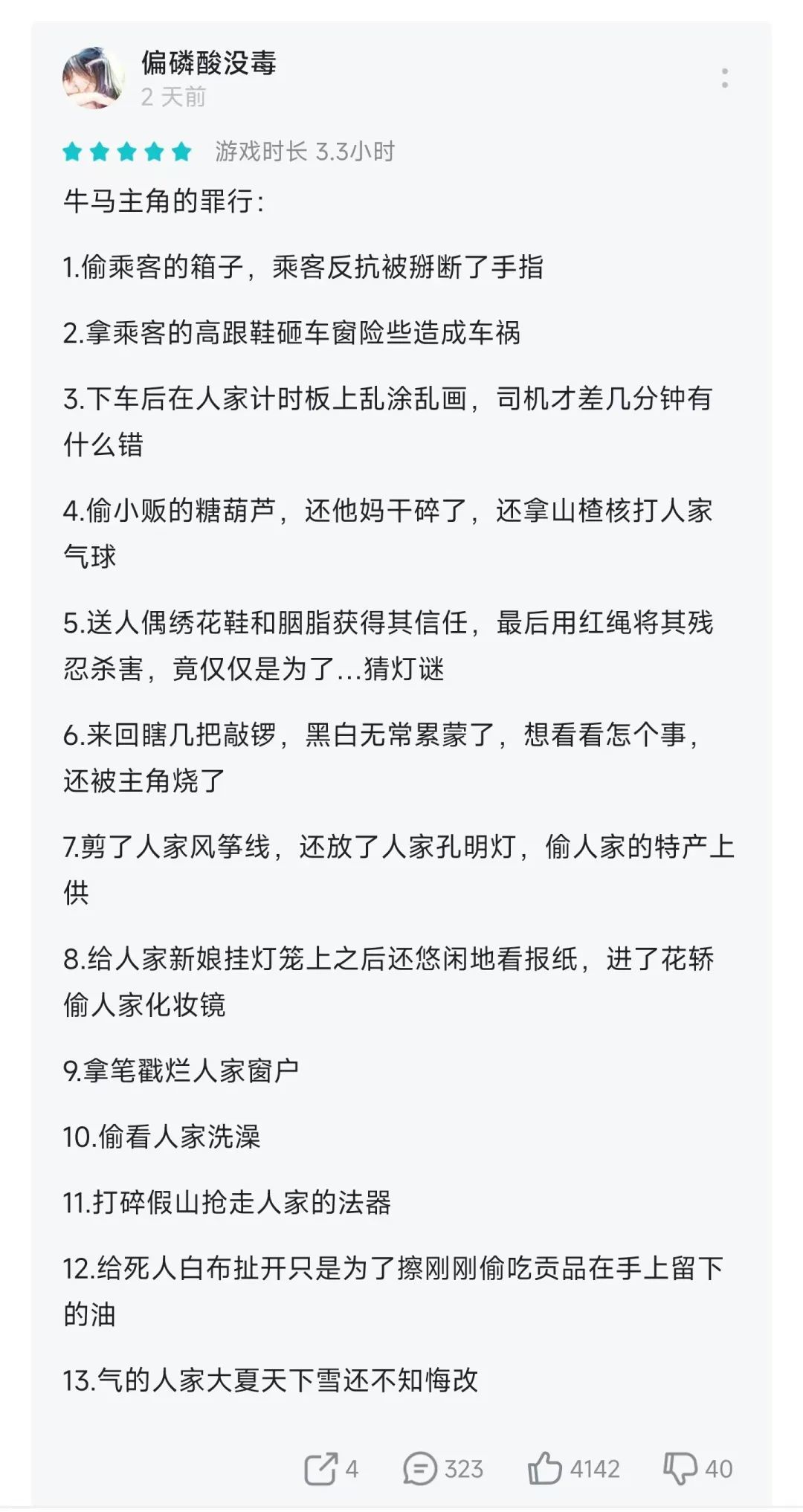 这周最欢乐的一条评价来自刚上线的《纸嫁衣4红丝缠》,这位玩家凭借对《纸嫁衣4》极其精确(bushi)的总结,收获了四千多个赞。上周五刚直播试玩这个游戏的我,看完之后已经笑飞了。(有剧透)