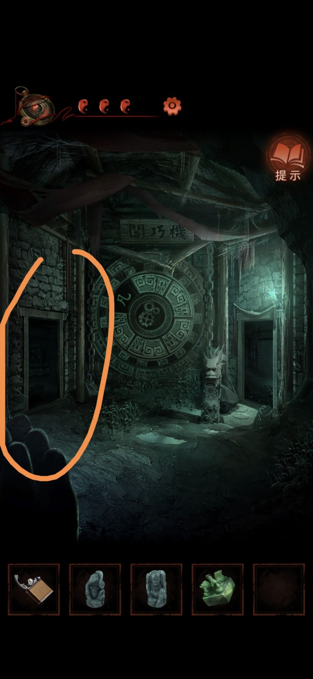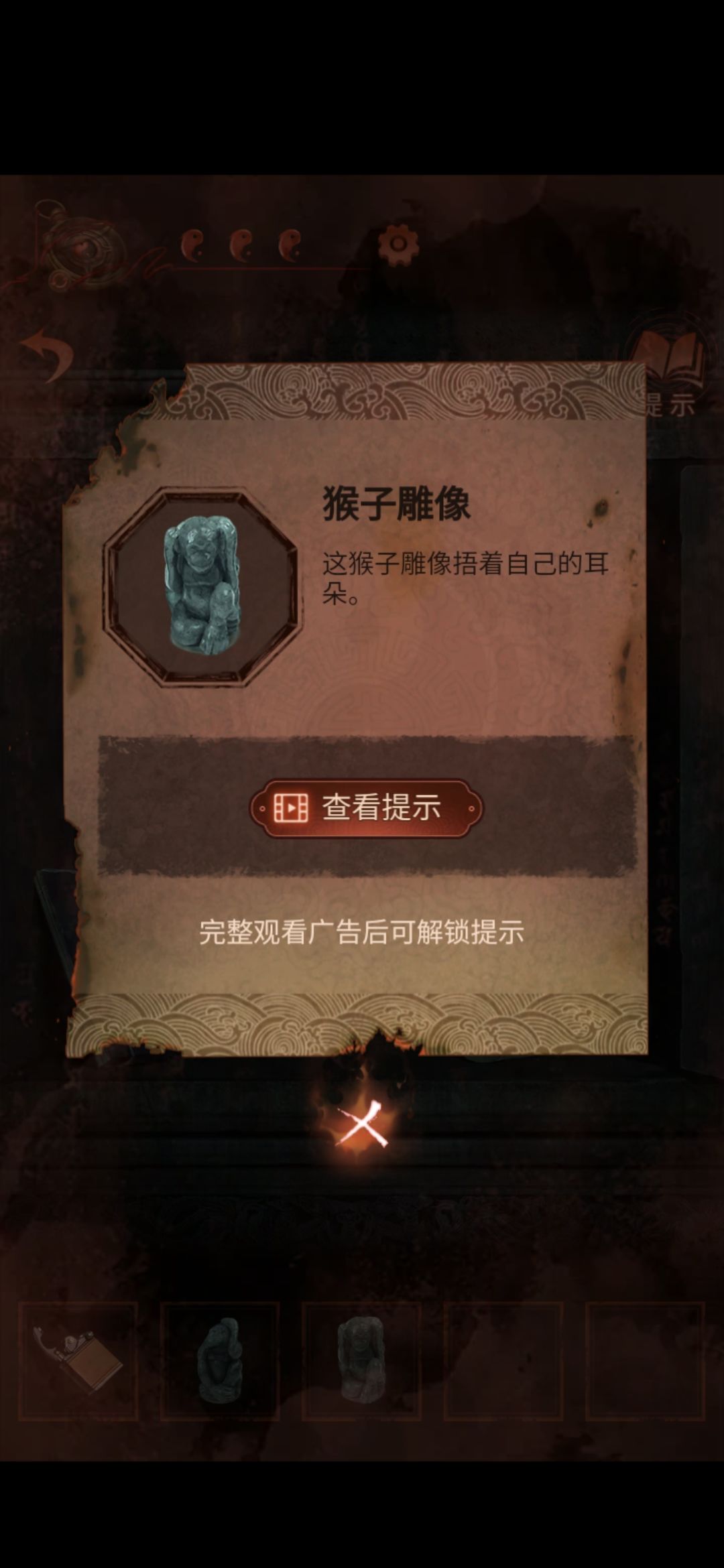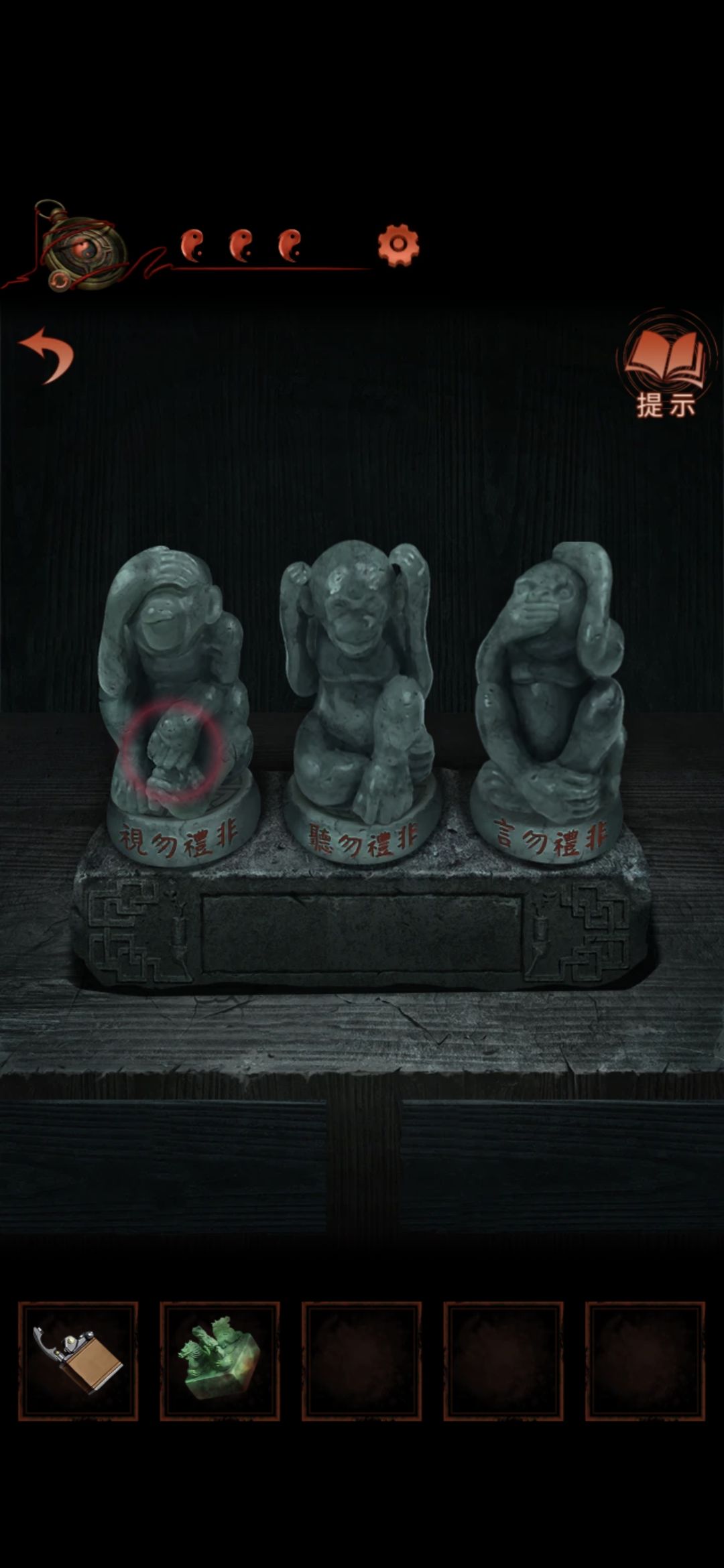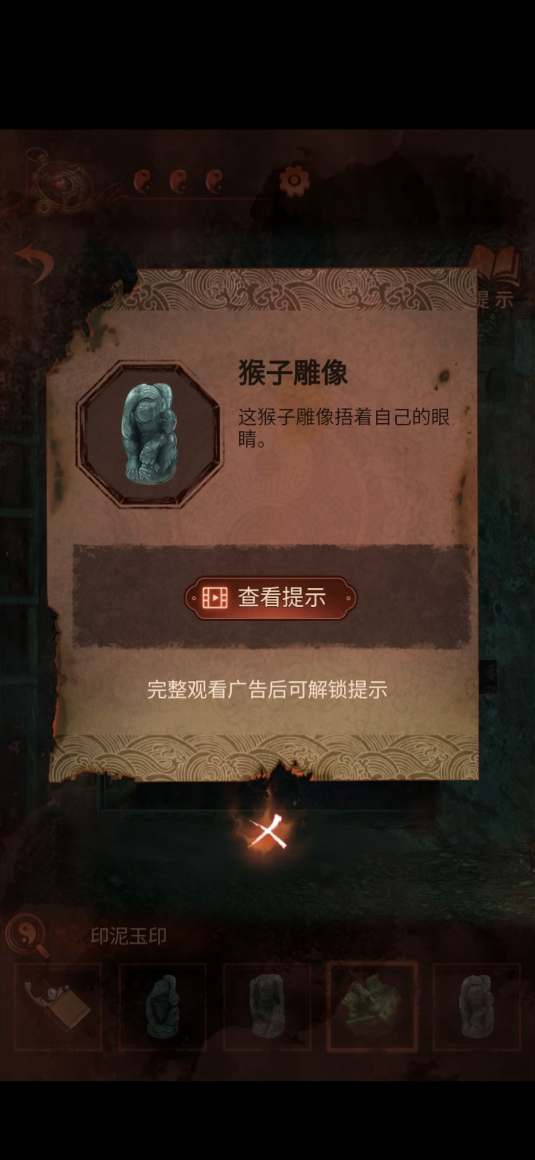 切换至老婆视角的大门,点击右侧门联,将印泥玉印盖到空白处,获得猴子雕像