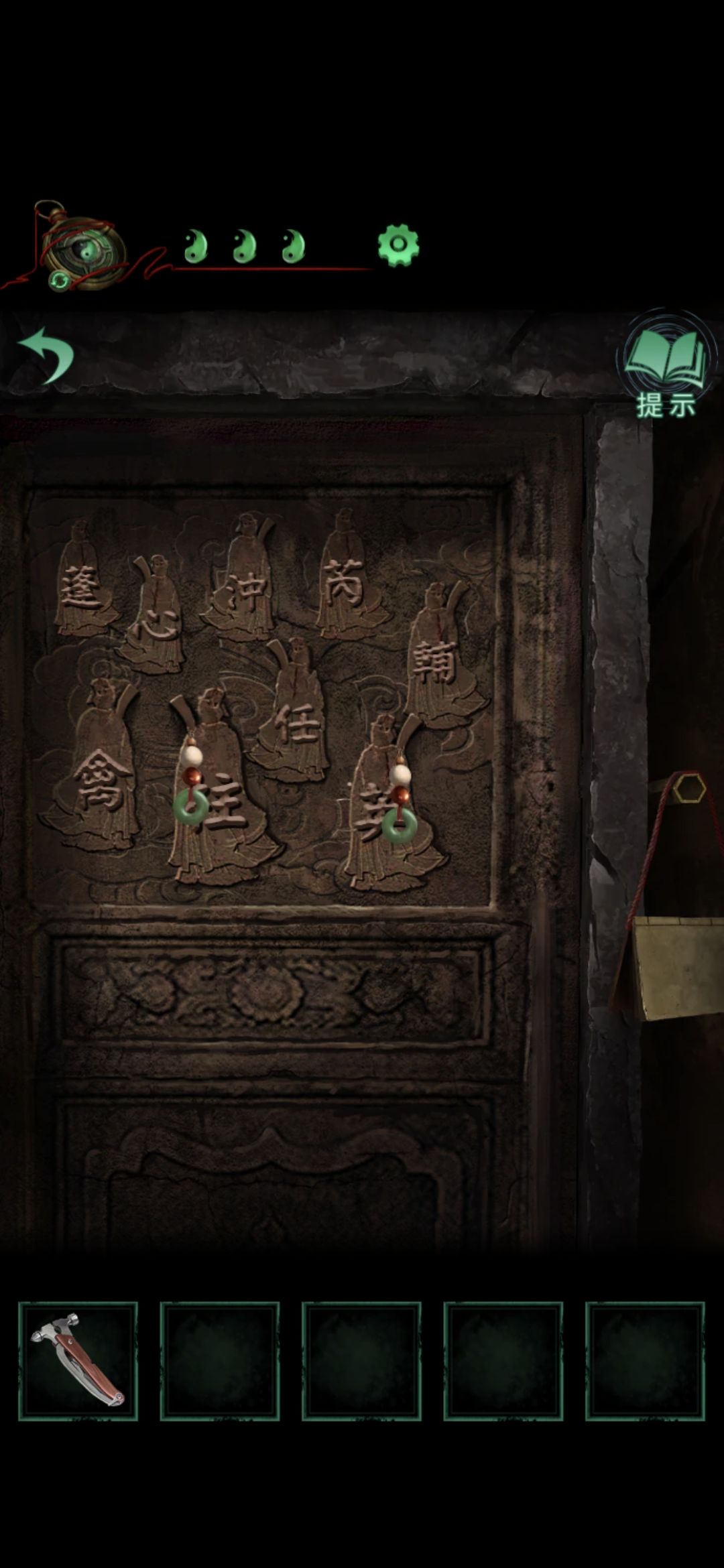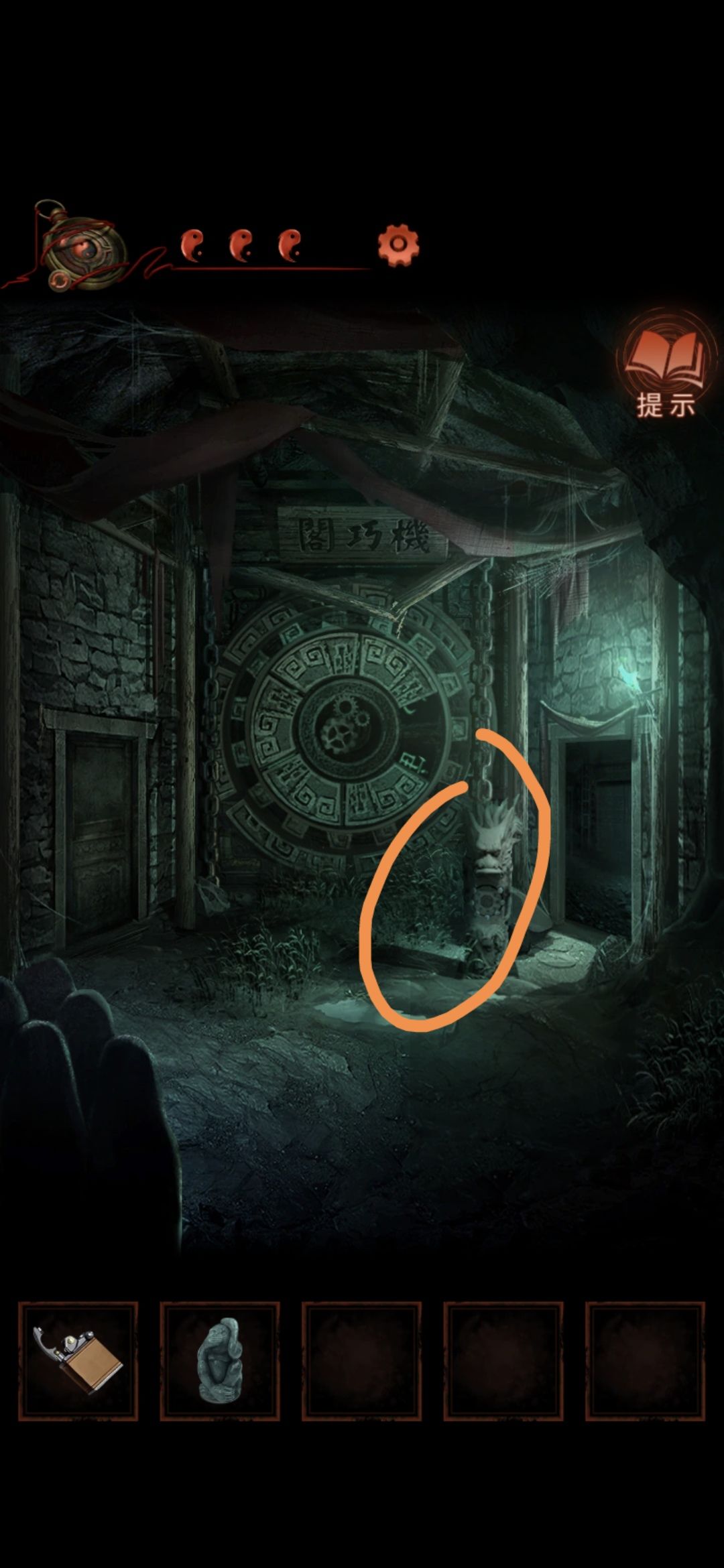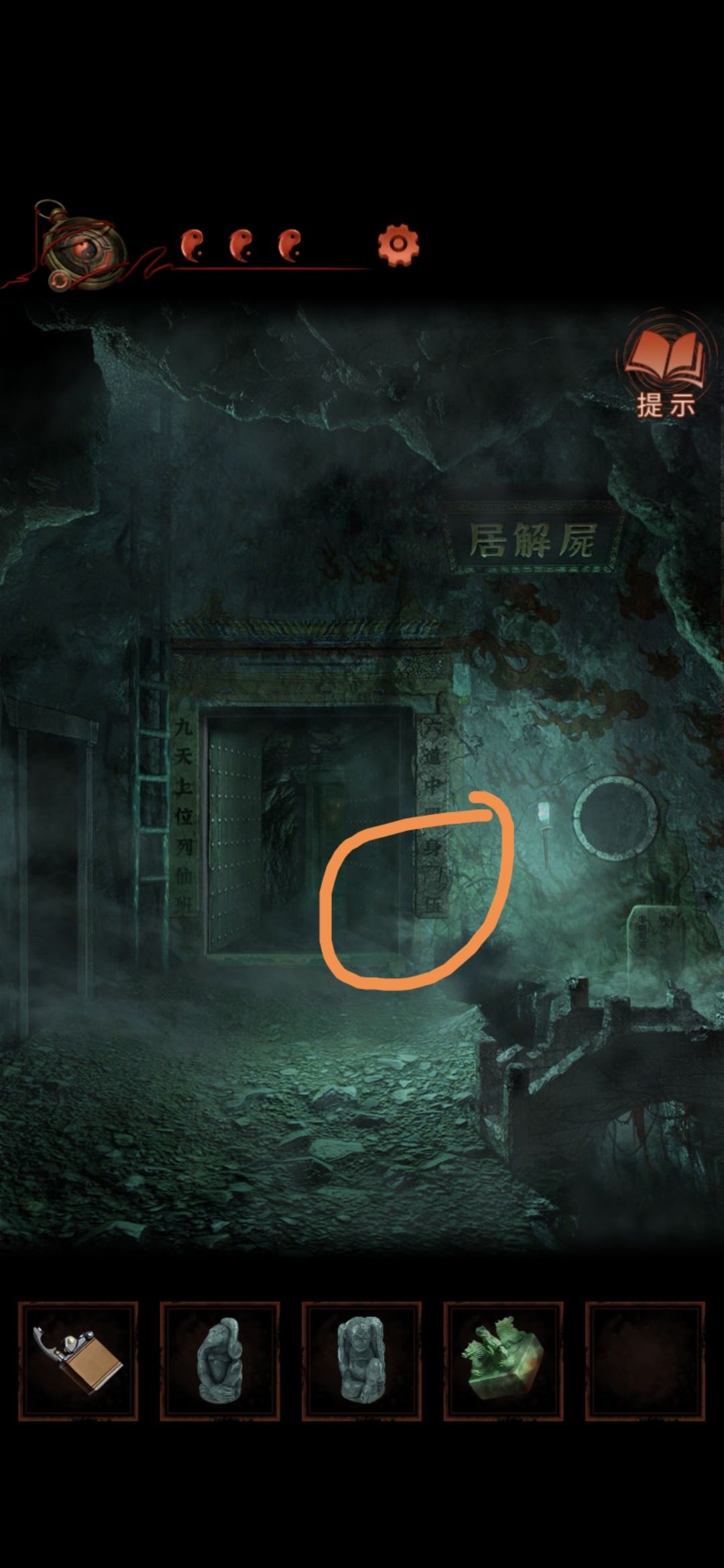 切换至老婆视角的大门,点击右侧门联,将印泥玉印盖到空白处,获得猴子雕像