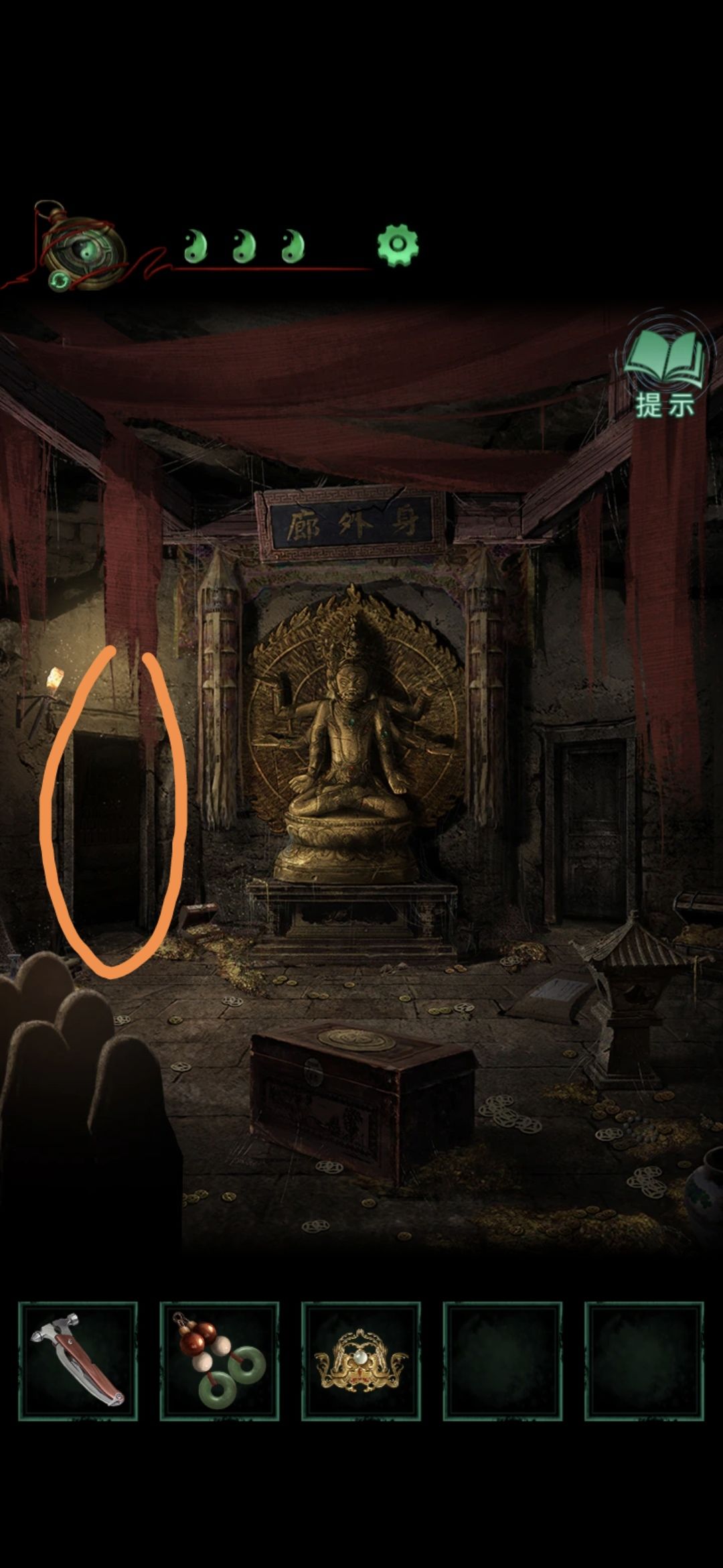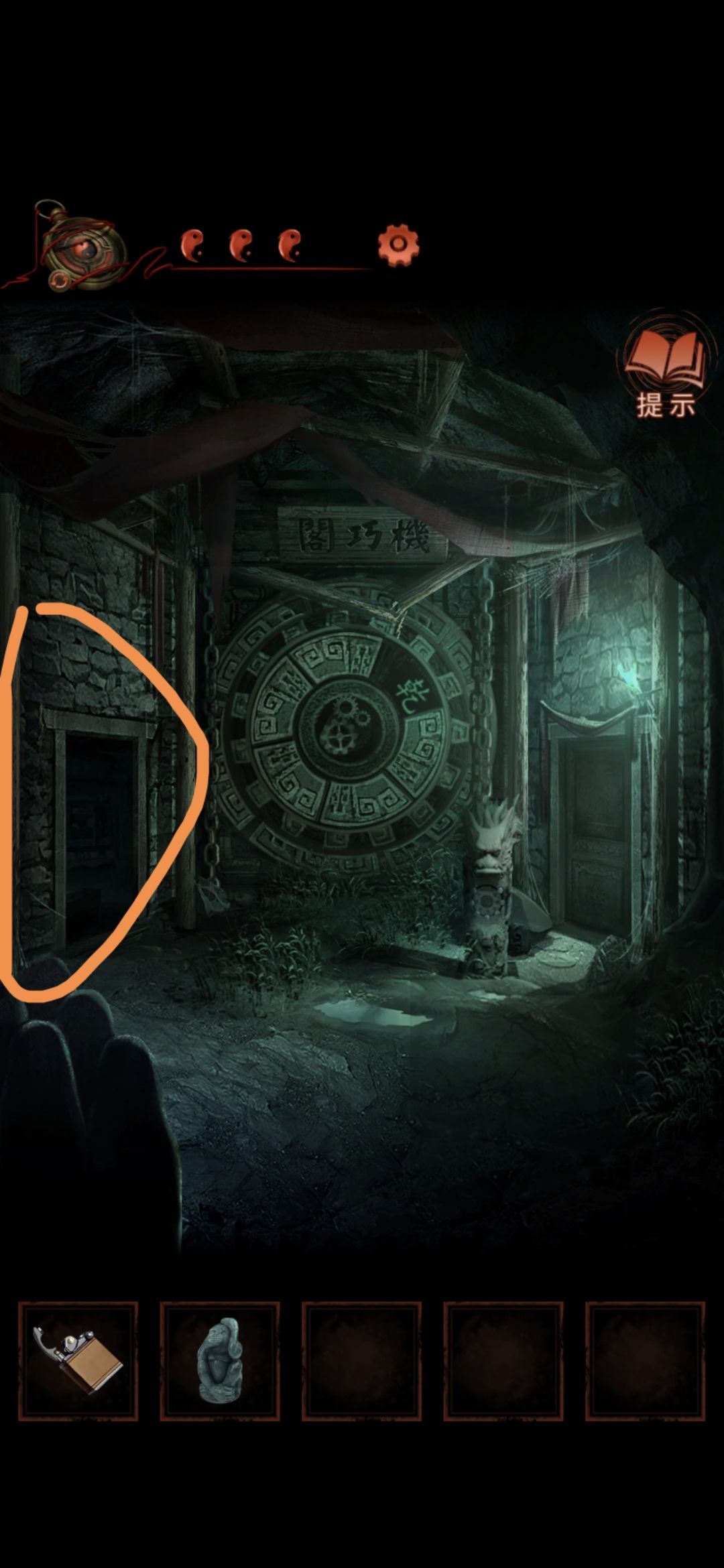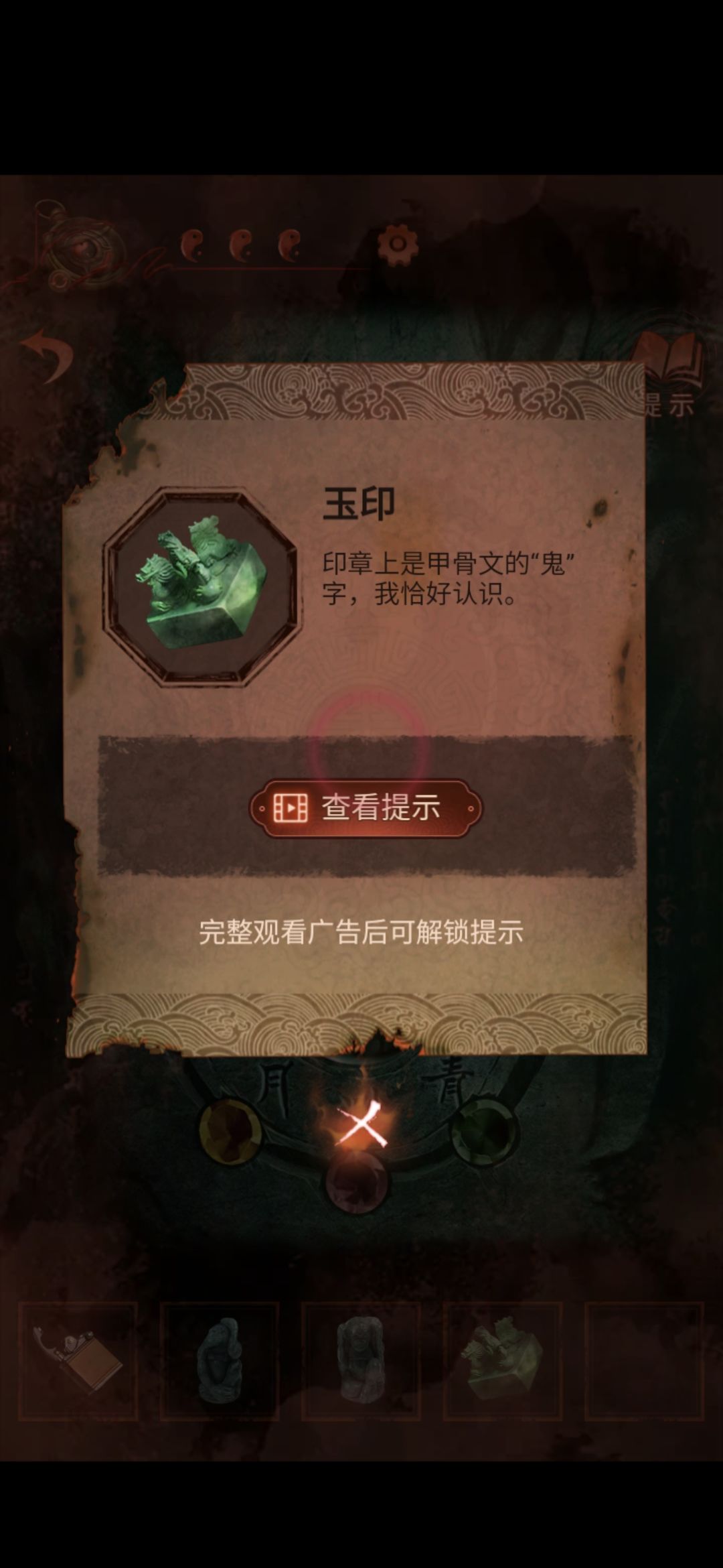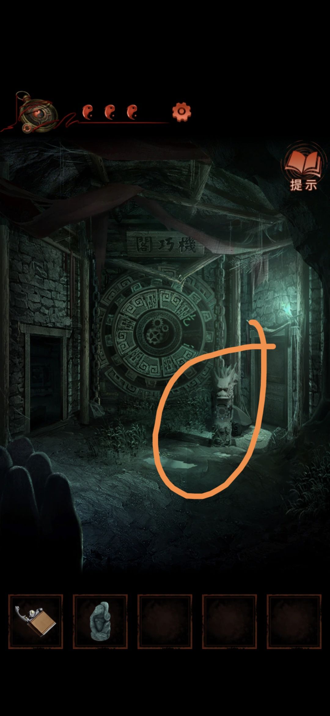 切换至老婆视角的大门,点击右侧门联,将印泥玉印盖到空白处,获得猴子雕像