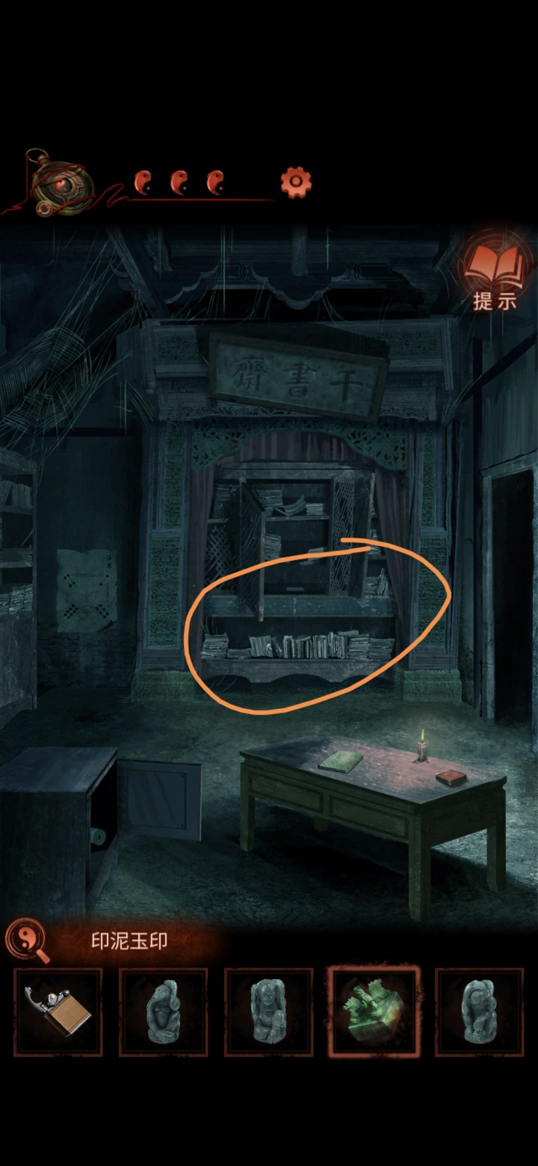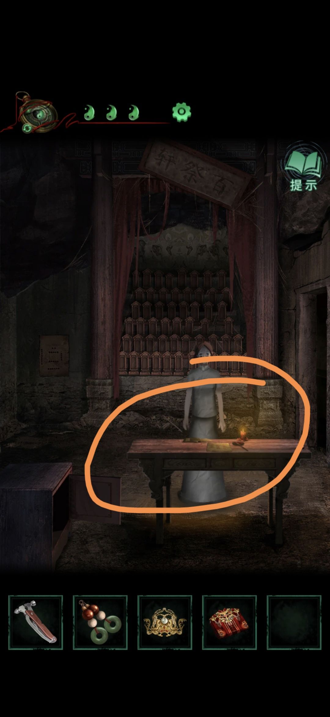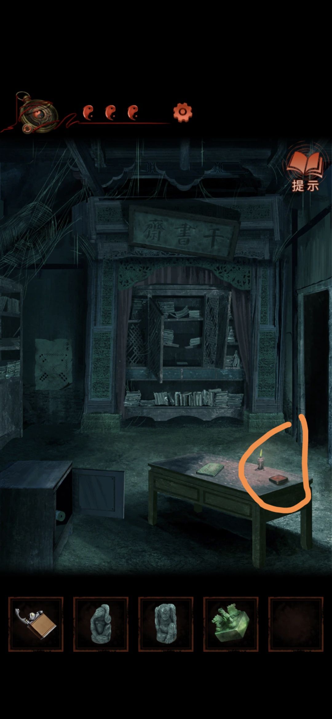 还是老婆视角,回到千书斋,点击中间的桌子,将猴子雕像按照石墩的描述摆放,然后下面的抽屉打开,获得纸条
