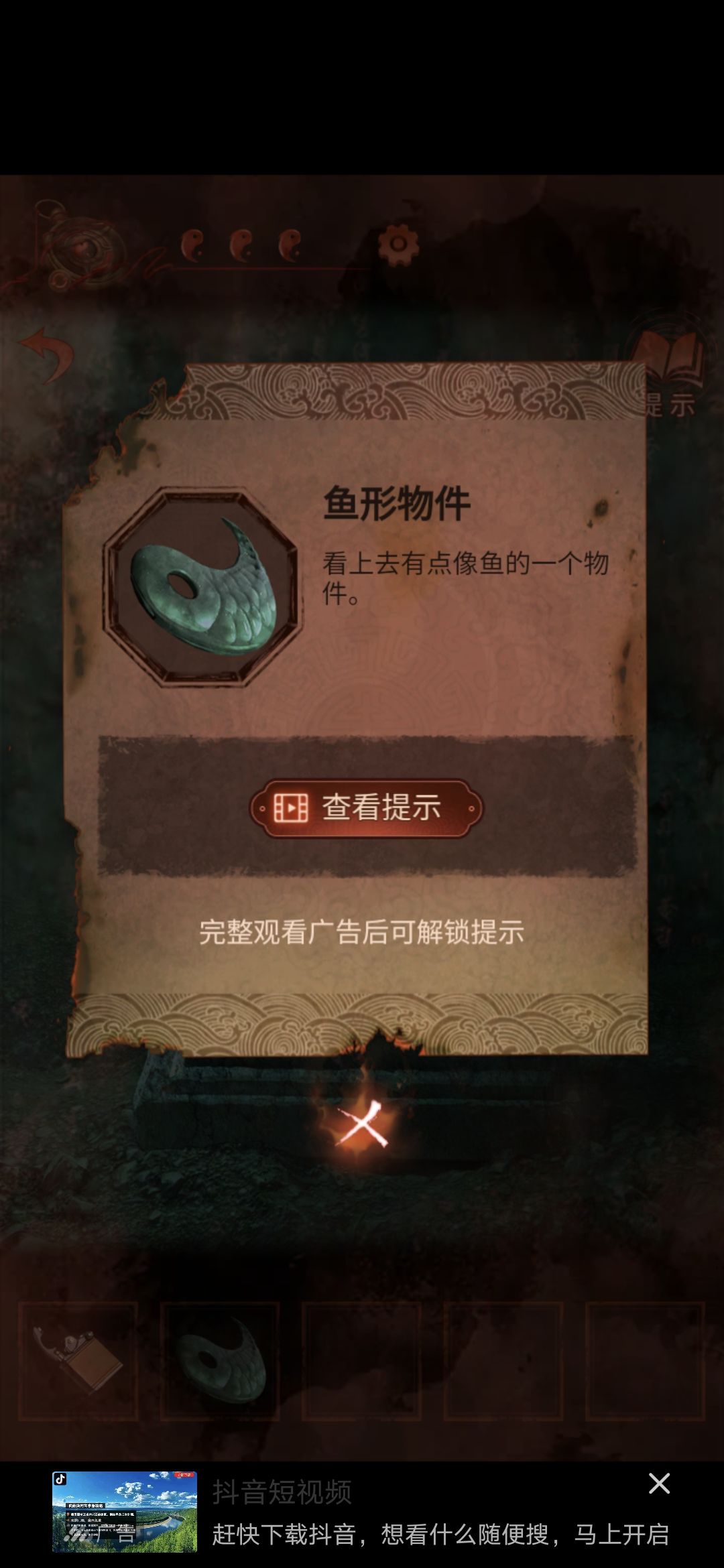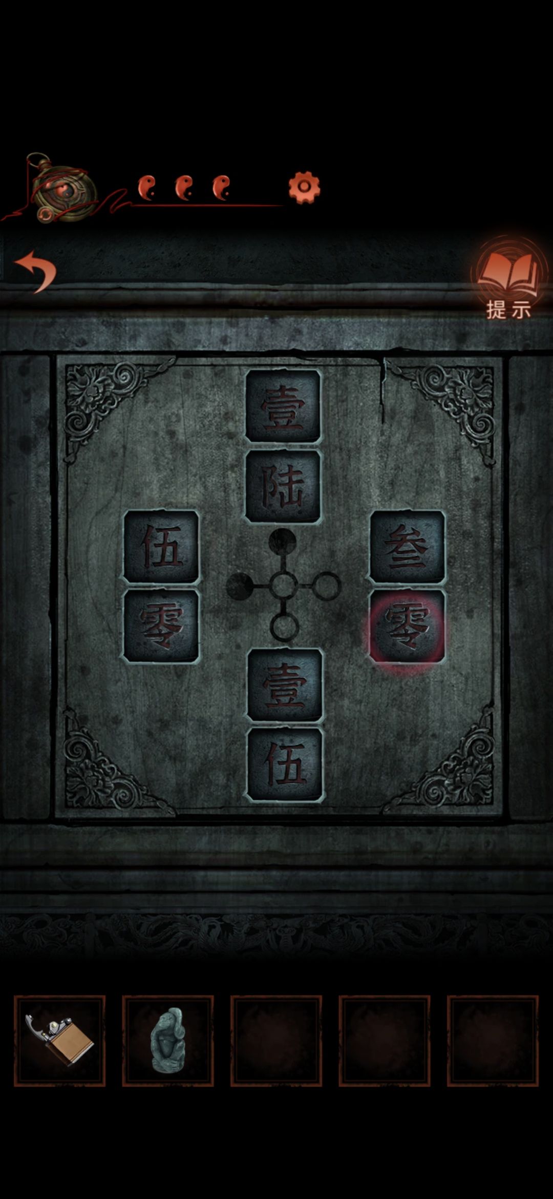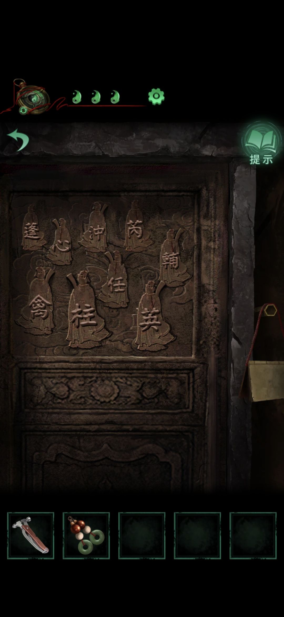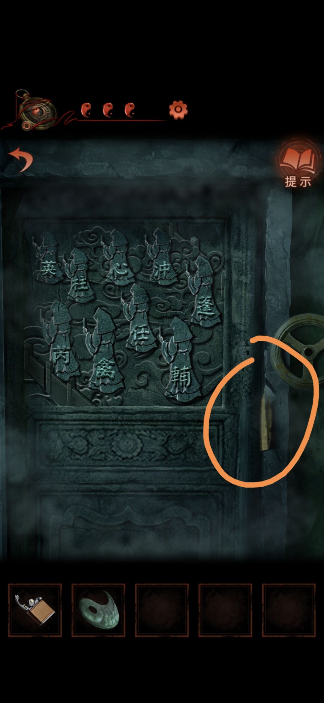 切换老婆视角,进入大门,点击墙缝,获得纸条,根据纸条内容和男主视角大门内内容对比,可得出应用打火机点燃字为英柱心沖芮的浮雕,点燃后获得鱼形物件
