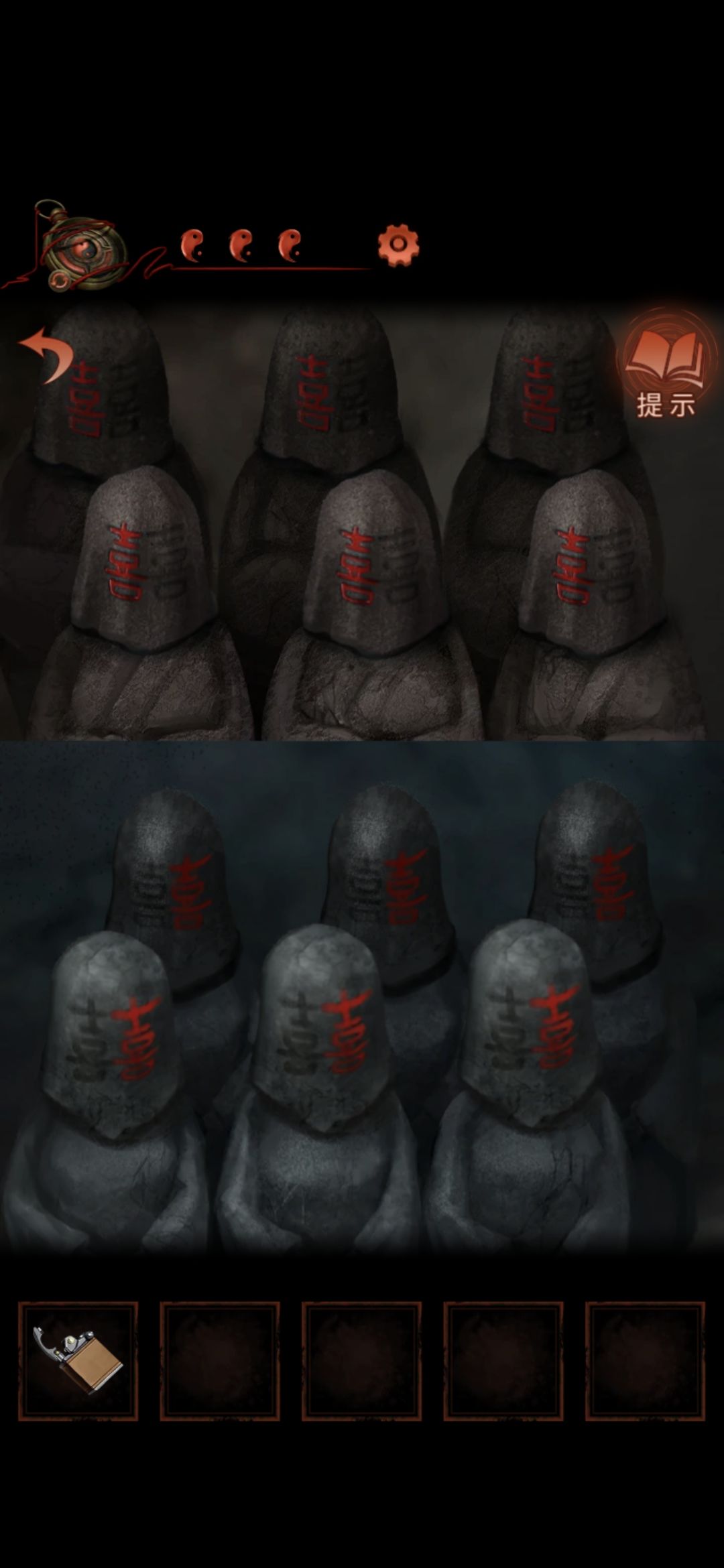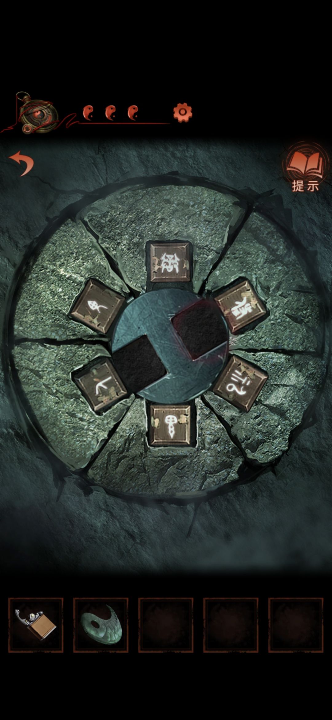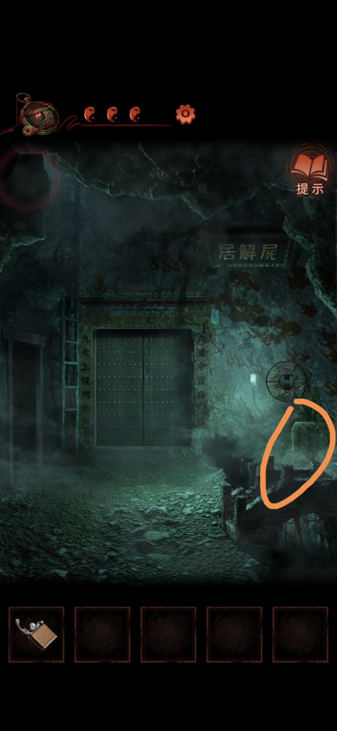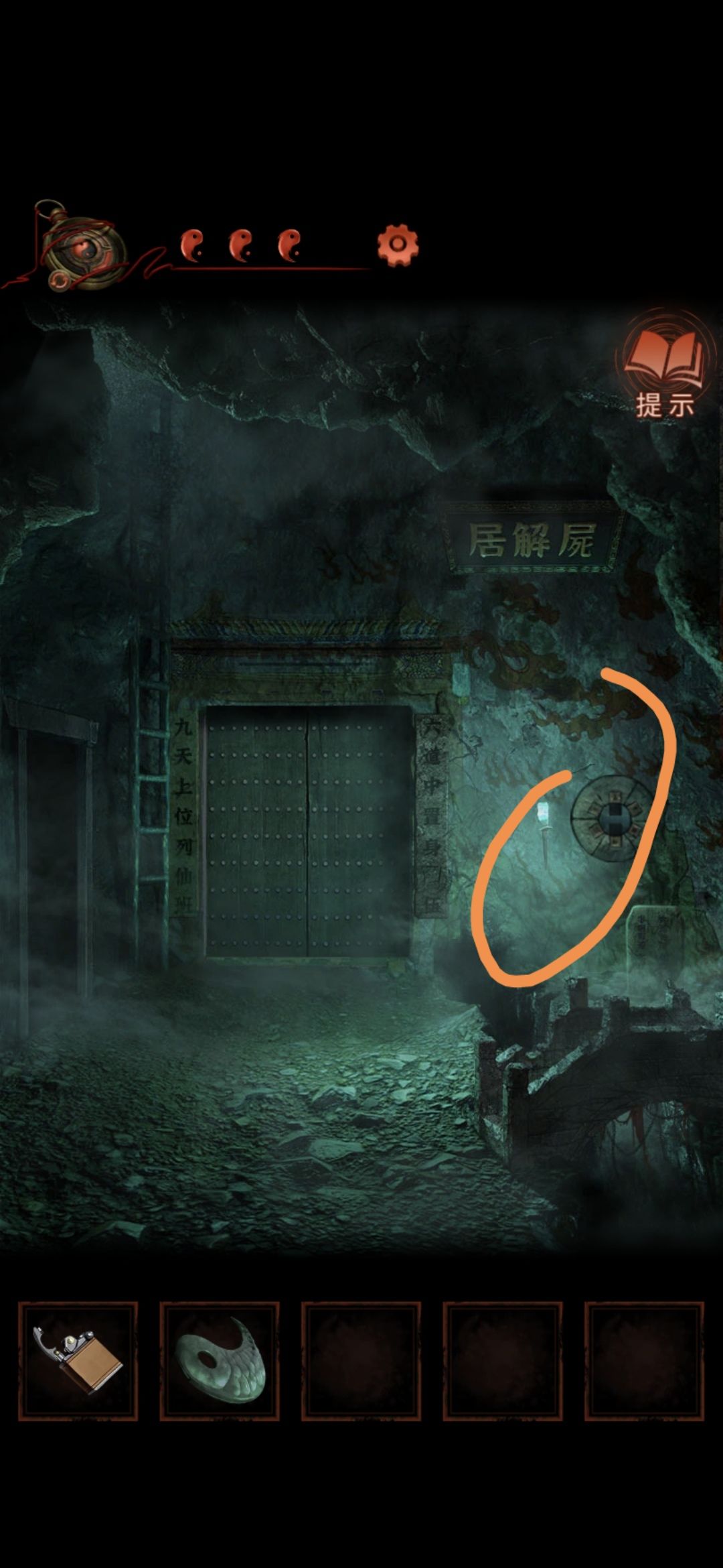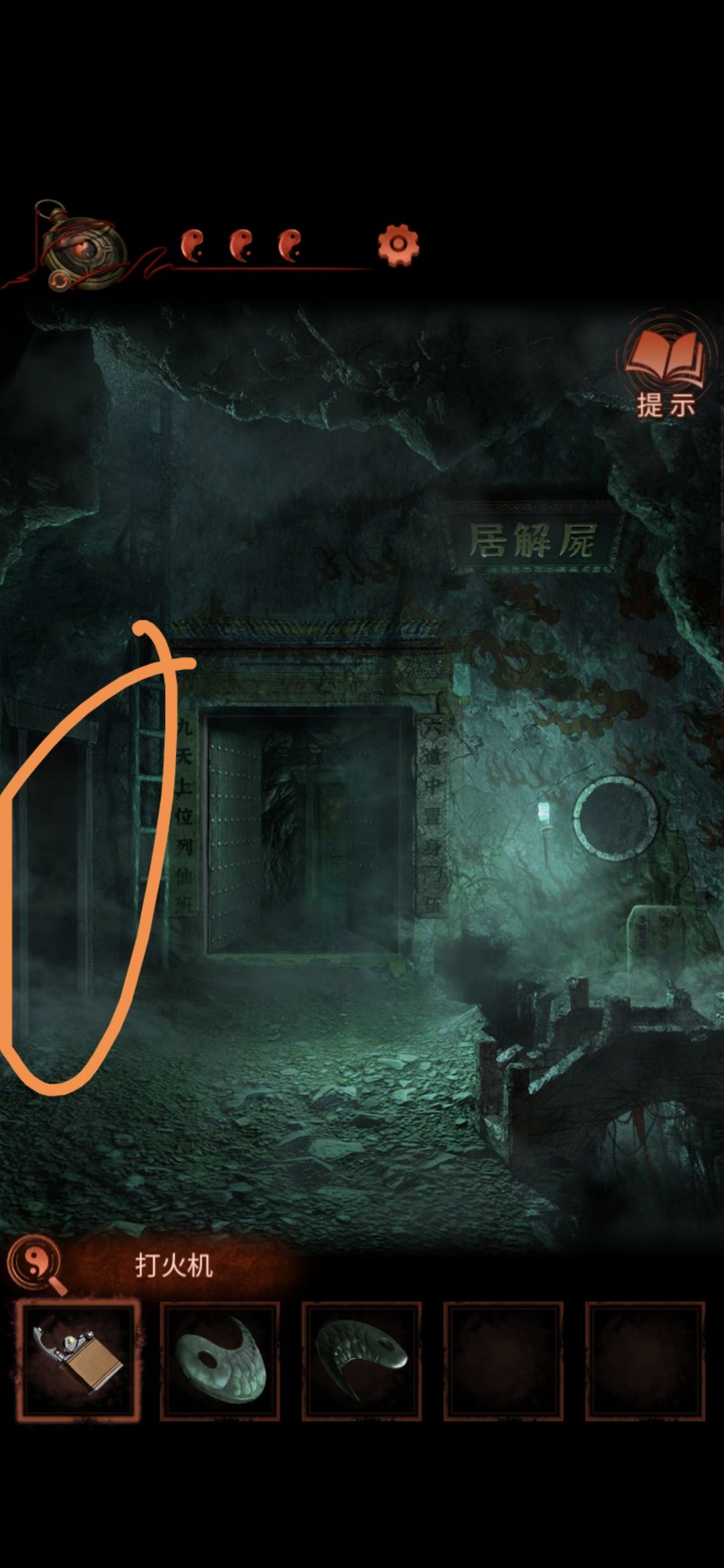 切换老婆视角,进入大门,点击墙缝,获得纸条,根据纸条内容和男主视角大门内内容对比,可得出应用打火机点燃字为英柱心沖芮的浮雕,点燃后获得鱼形物件