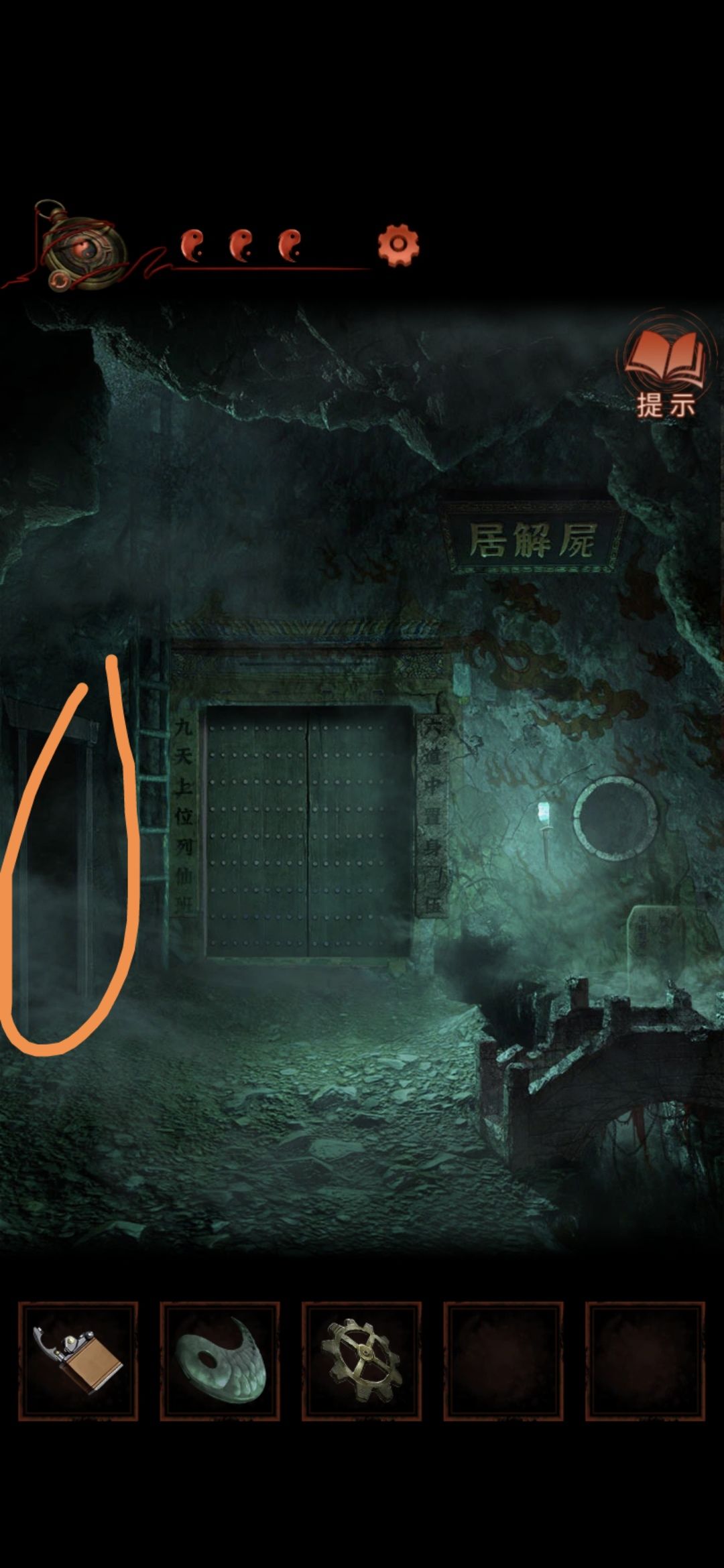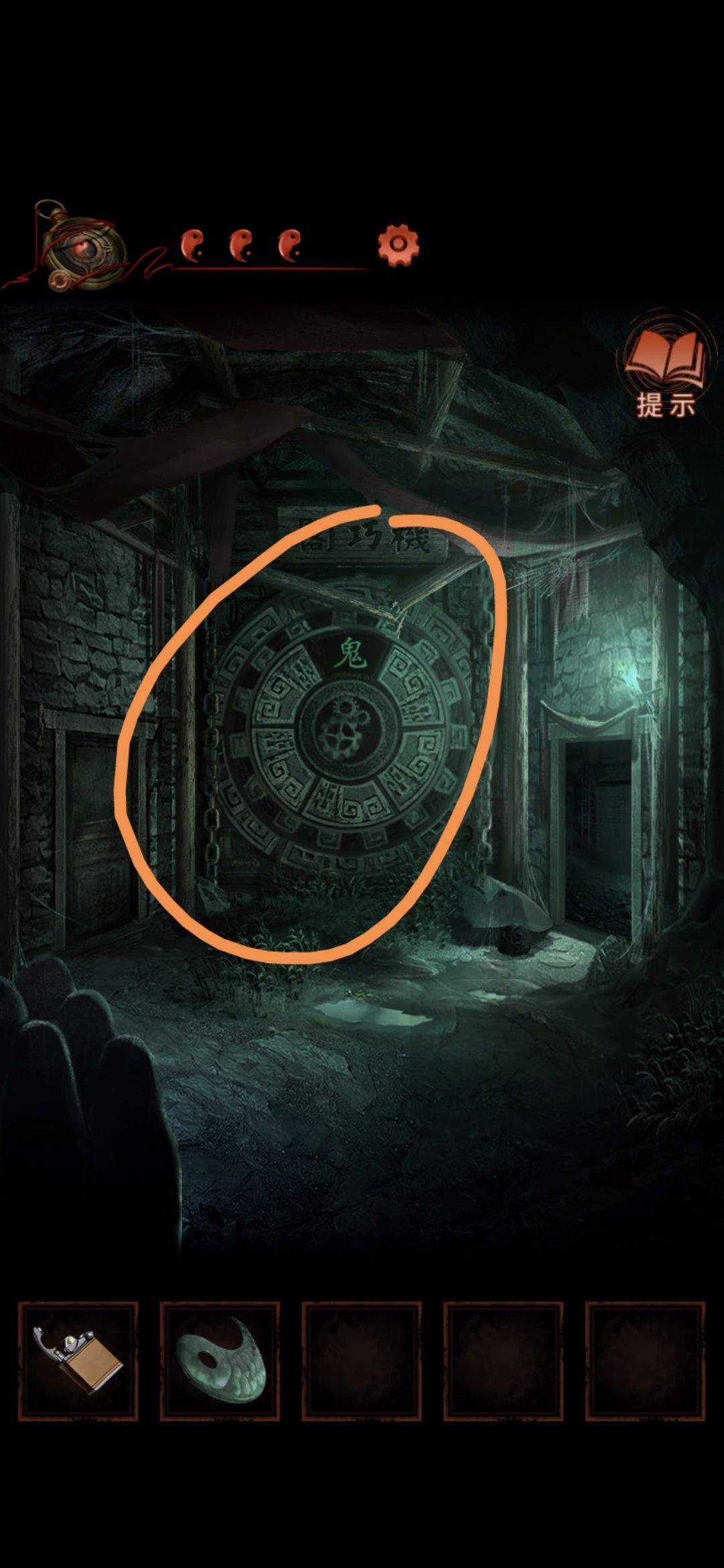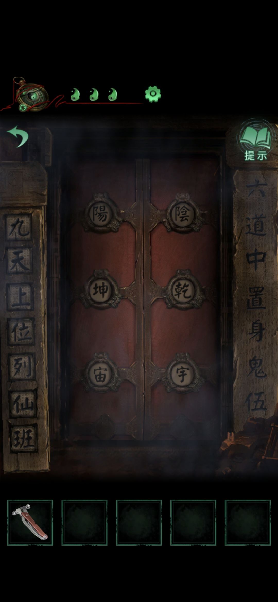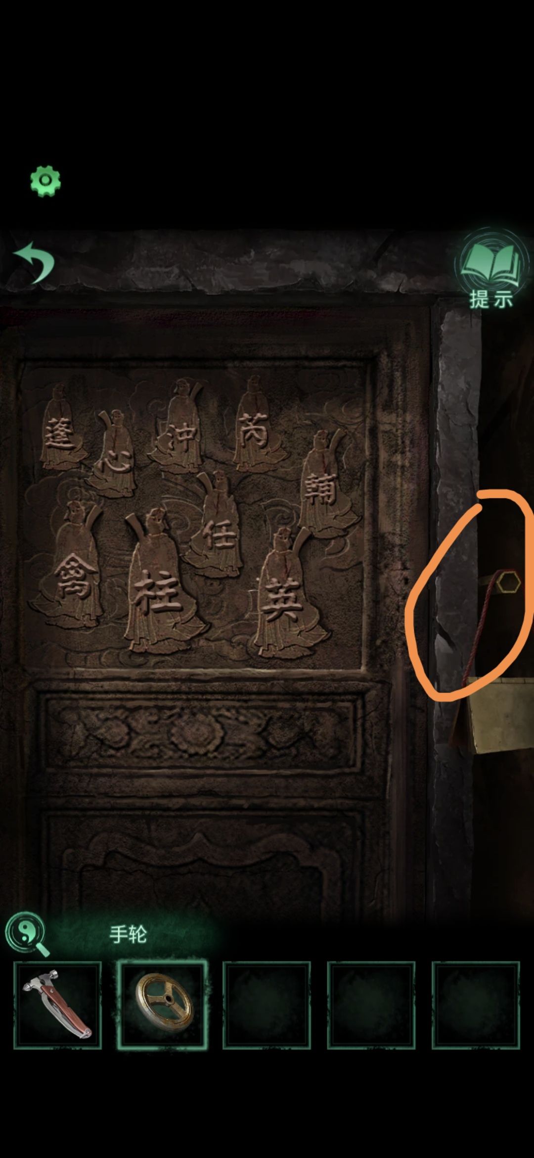 点击侧门,将轮状零件安装在墙上,观察齿轮上的字,顺序为乾宙坤神凡鬼,切换男主视角,点击大门,按从左到右从上到下的顺序排列,排好序后大门打开