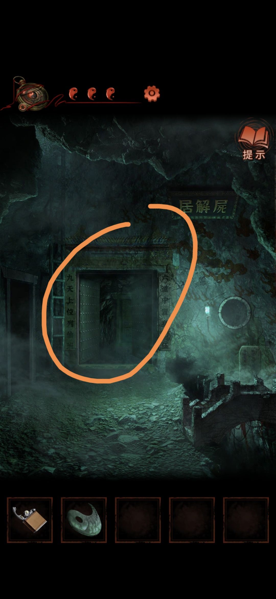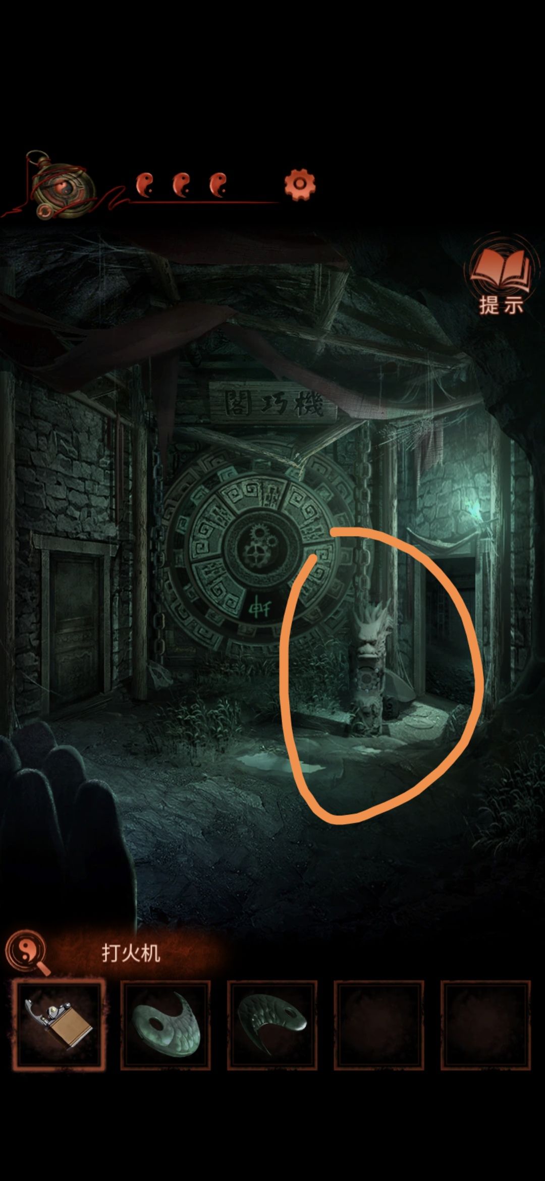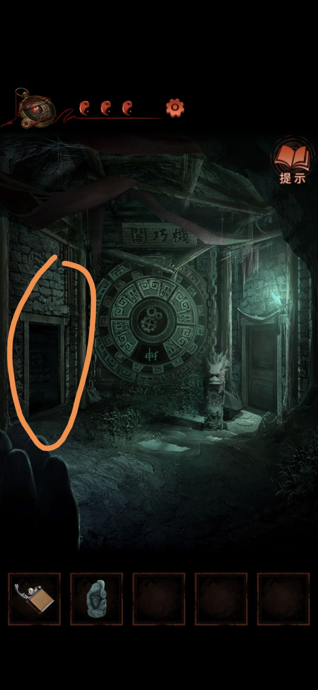 点击侧门,将轮状零件安装在墙上,观察齿轮上的字,顺序为乾宙坤神凡鬼,切换男主视角,点击大门,按从左到右从上到下的顺序排列,排好序后大门打开