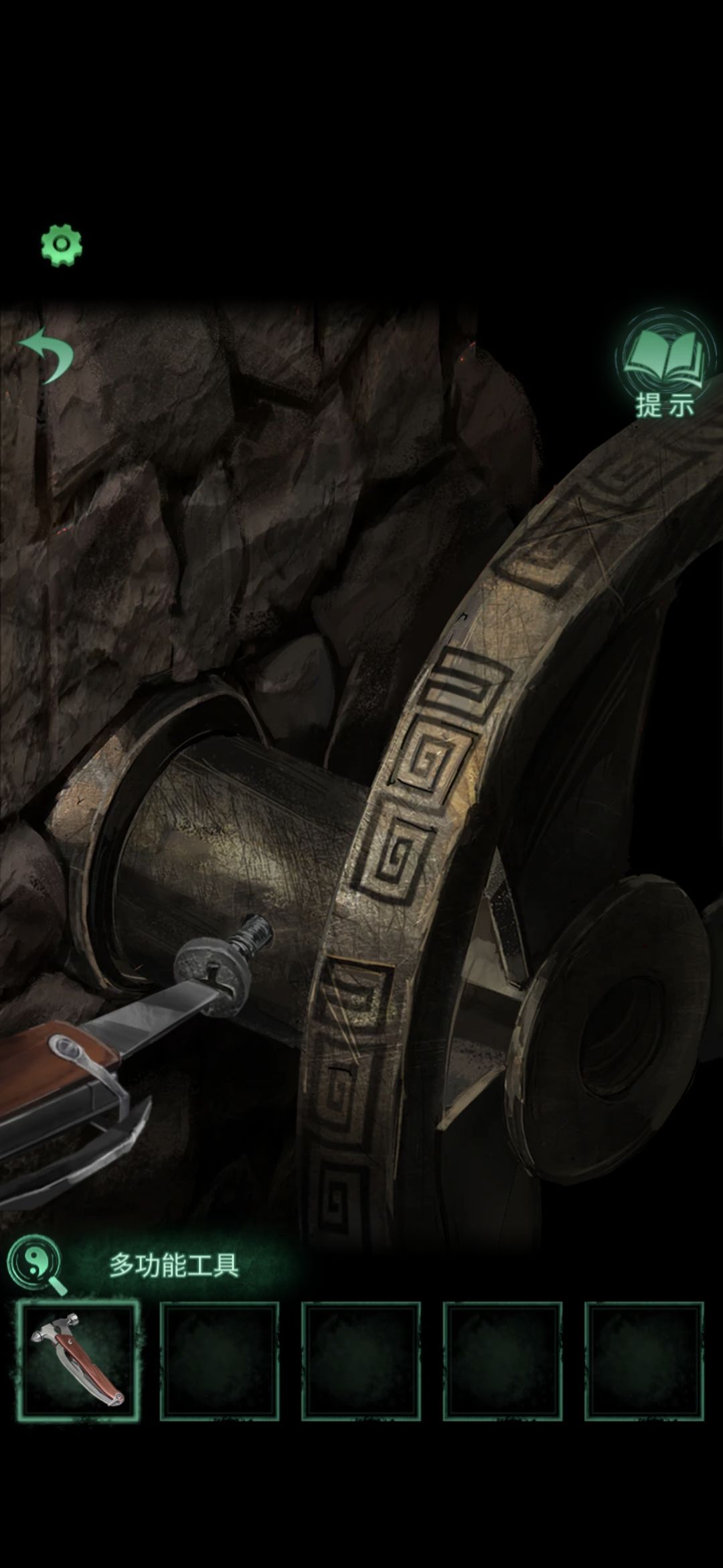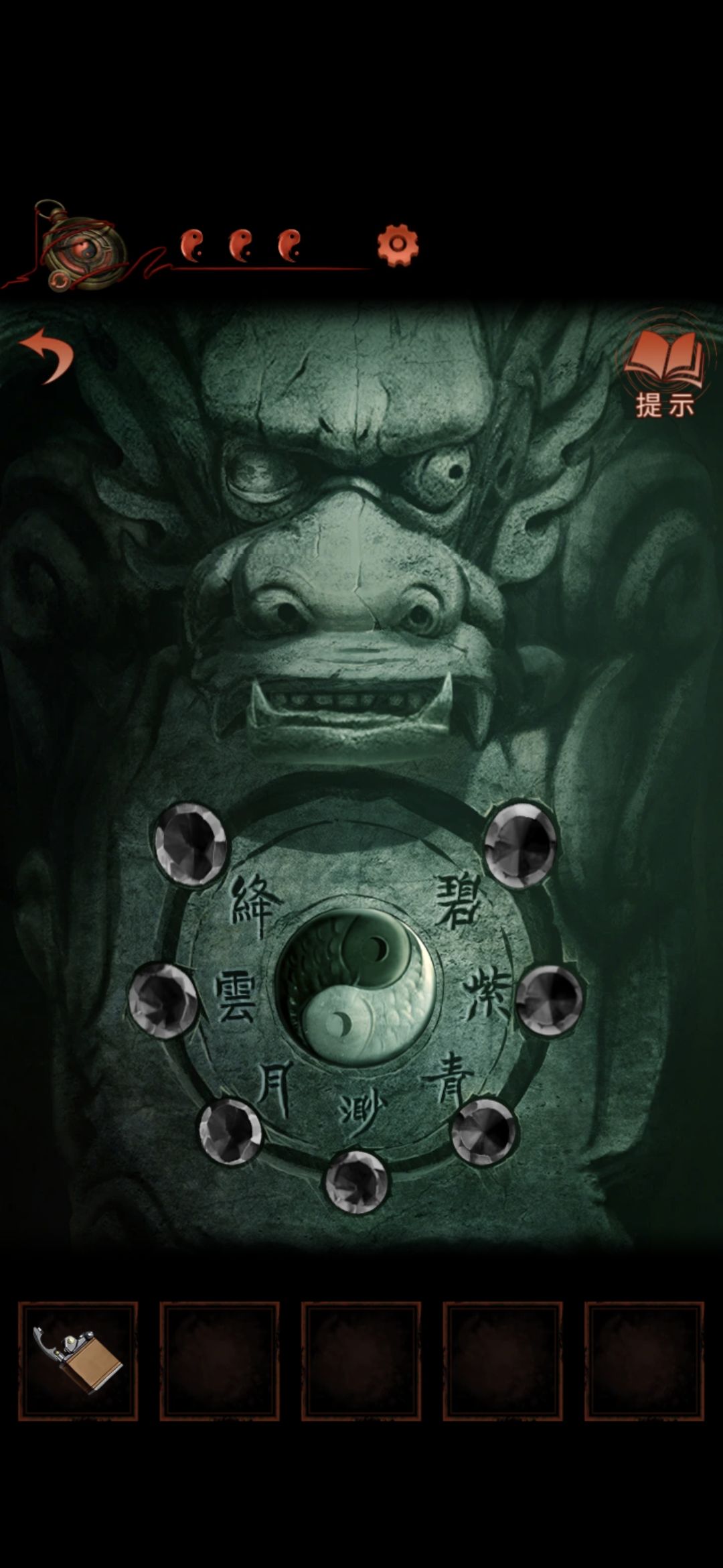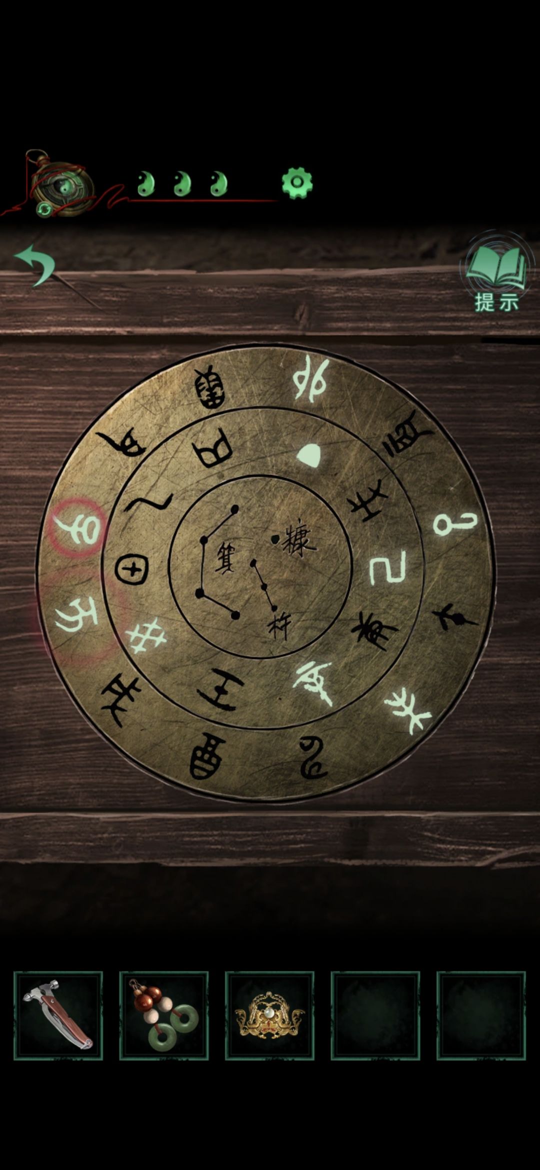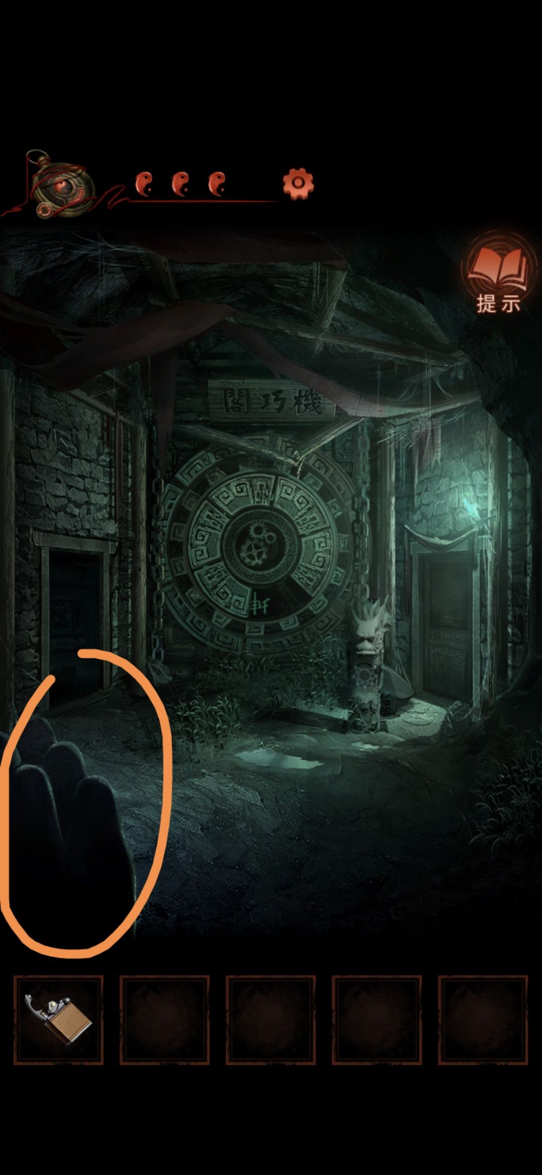 点击侧门,将轮状零件安装在墙上,观察齿轮上的字,顺序为乾宙坤神凡鬼,切换男主视角,点击大门,按从左到右从上到下的顺序排列,排好序后大门打开