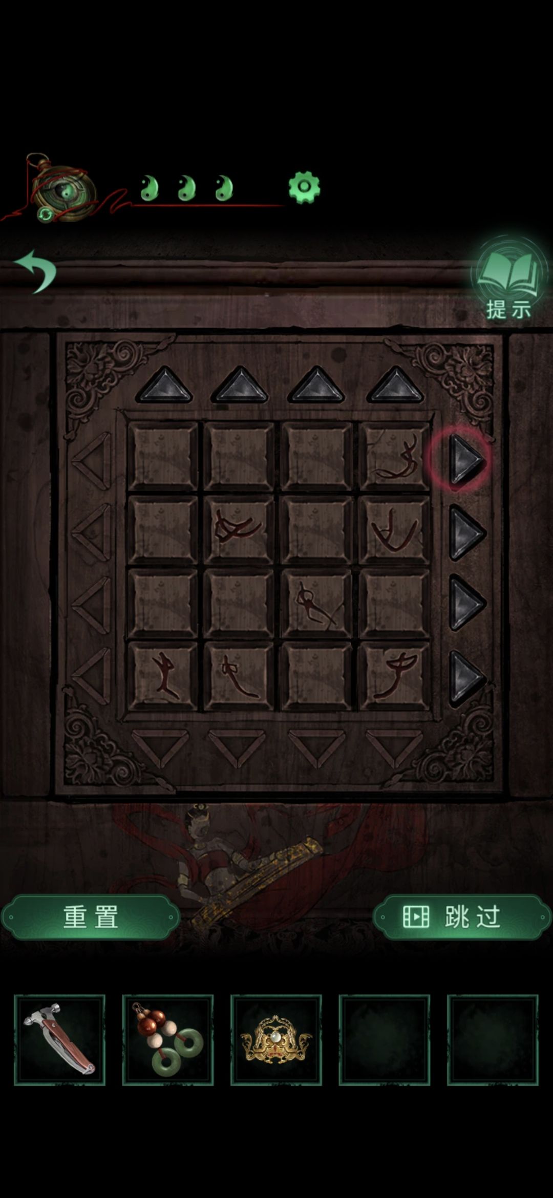 切换老婆视角,点击右下方柱子,根据飞天名字和颜色切换柱子上宝石颜色,点击狮子嘴获得玉印,点击侧门,点击桌子上印泥,获得印泥玉印