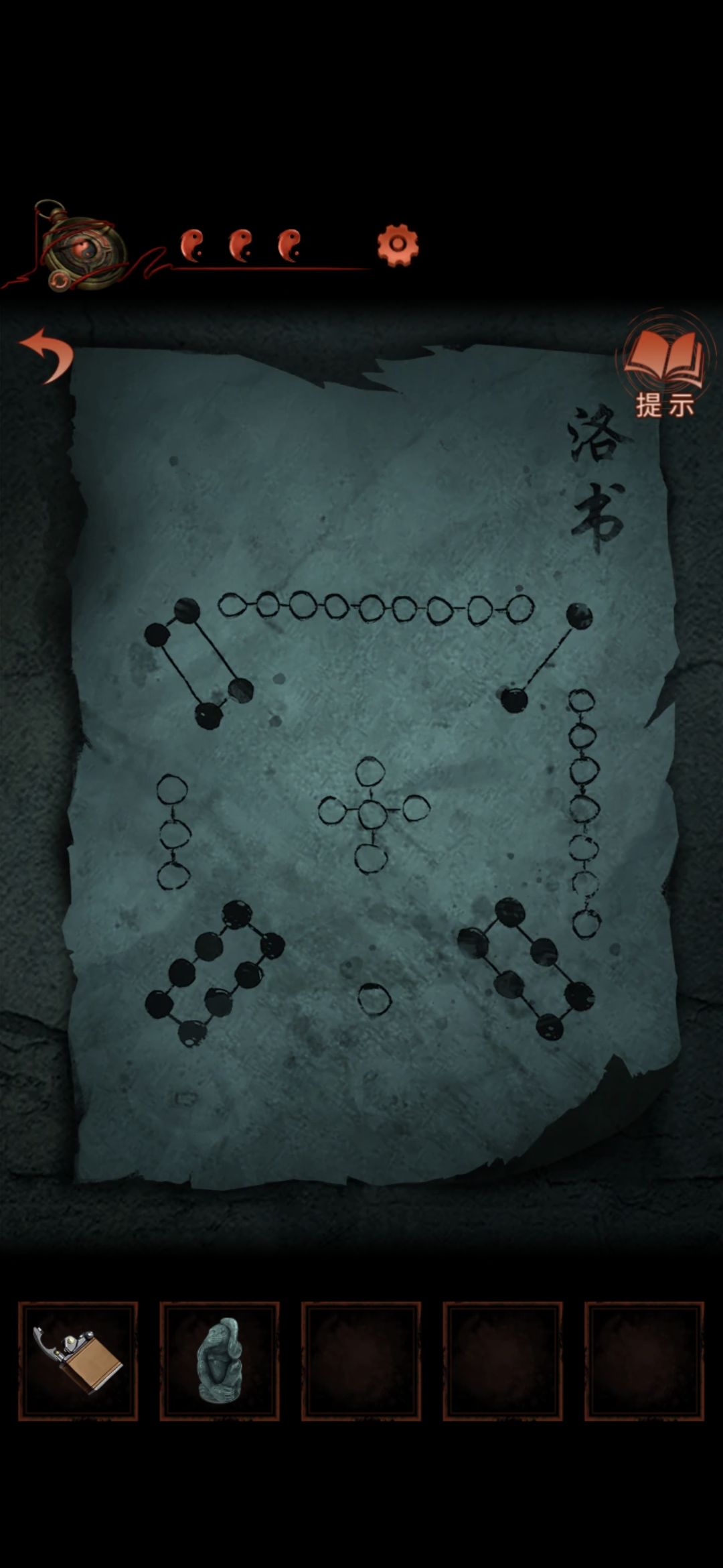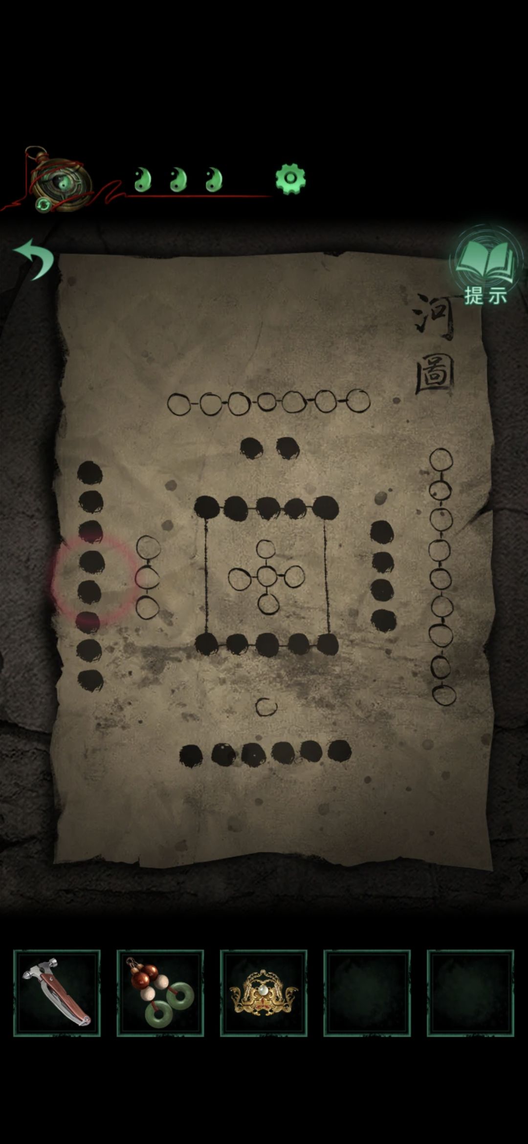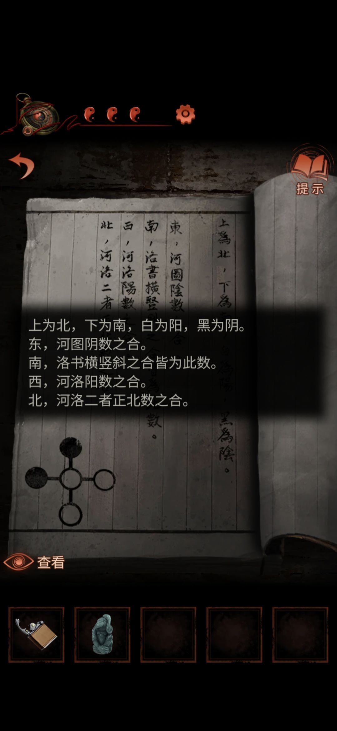 切换老婆视角,点击右下方柱子,点击太极图案,进入侧门,点击左下方箱子,根据所得资料解开箱子密码,右边为河图所有黑圈数相加为30,下边为洛书横竖斜的和为15,左边为河图洛书上所有白圈的和为50,上边为河图洛书所有上边的圈的和为16,解开箱子获得猴子雕像,看资料