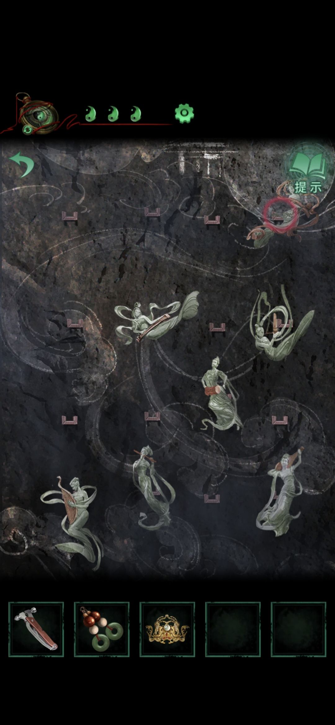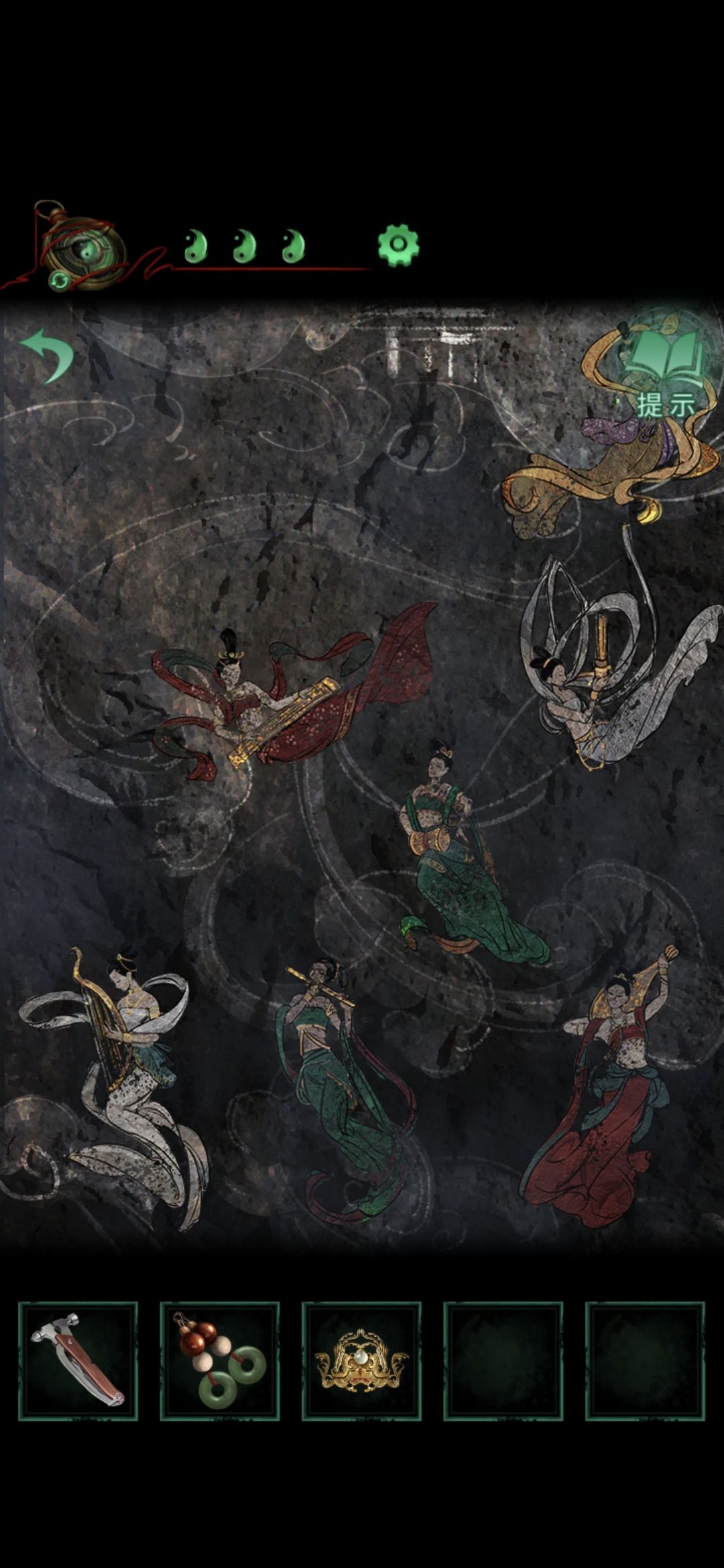 切换男主视角,进入百祭轩,点击左下方的箱子,上面的图案是飞天的姿势,按照飞天位置挪动图案,之后获得纸条